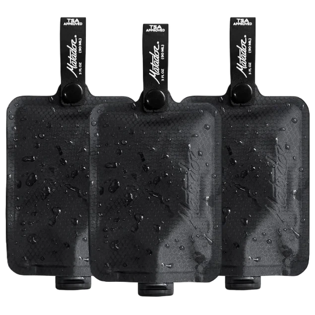 Juego de tres botellas de viaje Matador FlatPak Toiletry Bottle de nailon resistente, ideal para transportar champú, jabón o acondicionador.