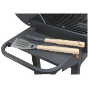 La construcción es de chapa de acero de alta calidad con un acabado negro duradero. Las asas de acero inoxidable tienen un amplio espacio de agarre y añaden elegancia a la parrilla. La estabilidad está garantizada por las patas metálicas, complementadas por un marco de refuerzo en la parte inferior. Además, la parrilla está equipada con ruedas de plástico que garantizan una movilidad suficiente.