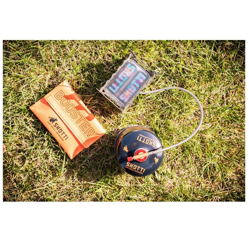 SKOTTI Booster es compatible con todos los cartuchos de tornillo estándar EN 417 y funciona con la mayoría de los utensilios de cocina comunes, ya sean sartenes o cacerolas pequeñas. También combina perfectamente con la parrilla SKOTTI Mini, que se puede transformar en una parrilla de gas limpia y potente. Esta combinación acelerará significativamente la preparación de alimentos y simplificará la cocina en lugares donde no hay espacio o tiempo para hacer fuego.