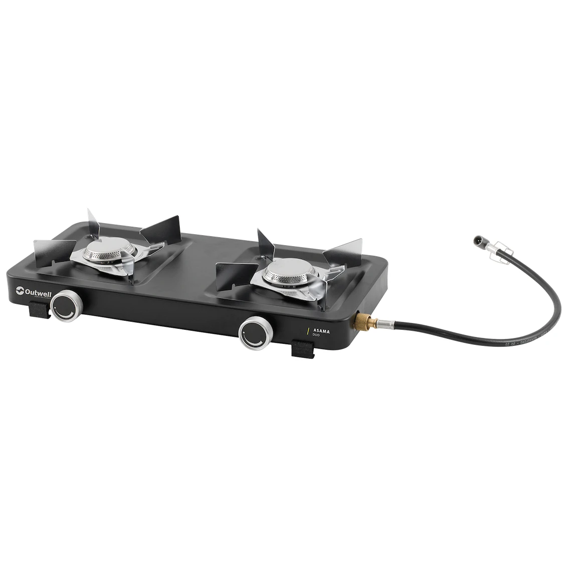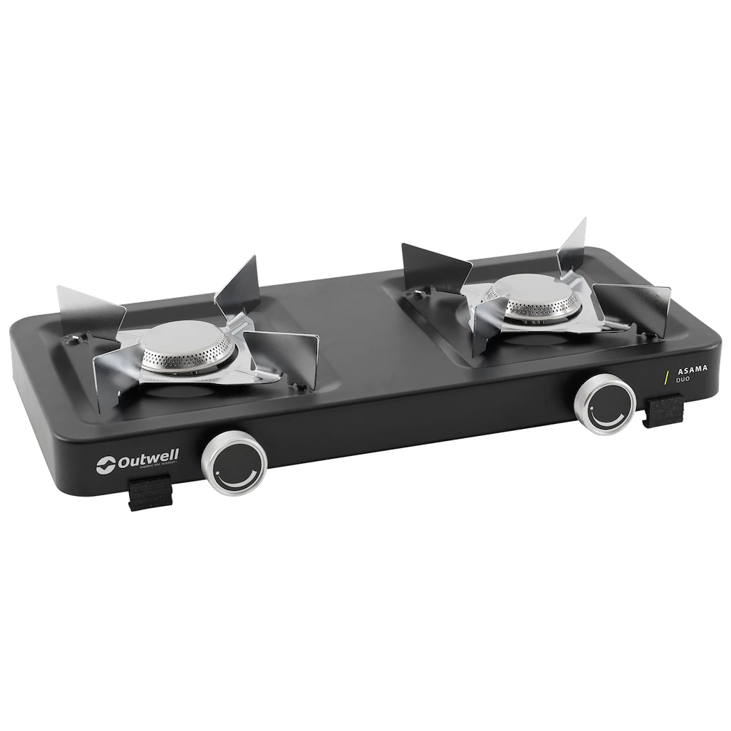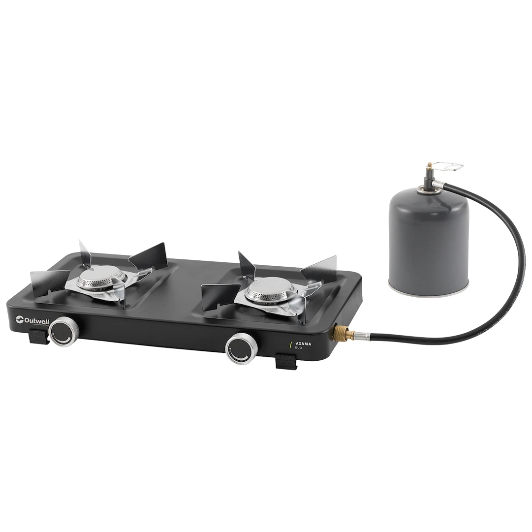Hornillo de gas de dos fuegos Asama Duo del fabricante danés Outwell es un ayudante indispensable para el camping y el jardín. El material de acero y acero inoxidable garantiza una larga vida útil. La construcción es baja, muy estable gracias a las patas de plástico y los quemadores están equipados con una rejilla ancha para colocar de forma segura los recipientes.