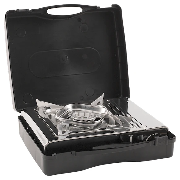 El quemador tiene una potencia de hasta 2000 W, un mando giratorio de zinc para su regulación continua y encendido piezoeléctrico. En el interior hay un espacio integrado para cartuchos de butano MSF-1A. El sistema de seguridad Gasguard evita fugas de gas no deseadas en caso de que la llama se apague. Podrás transportar fácilmente el hornillo gracias a la robusta bolsa de viaje.