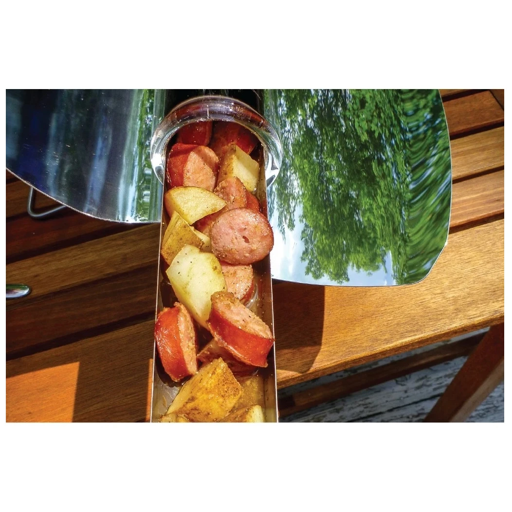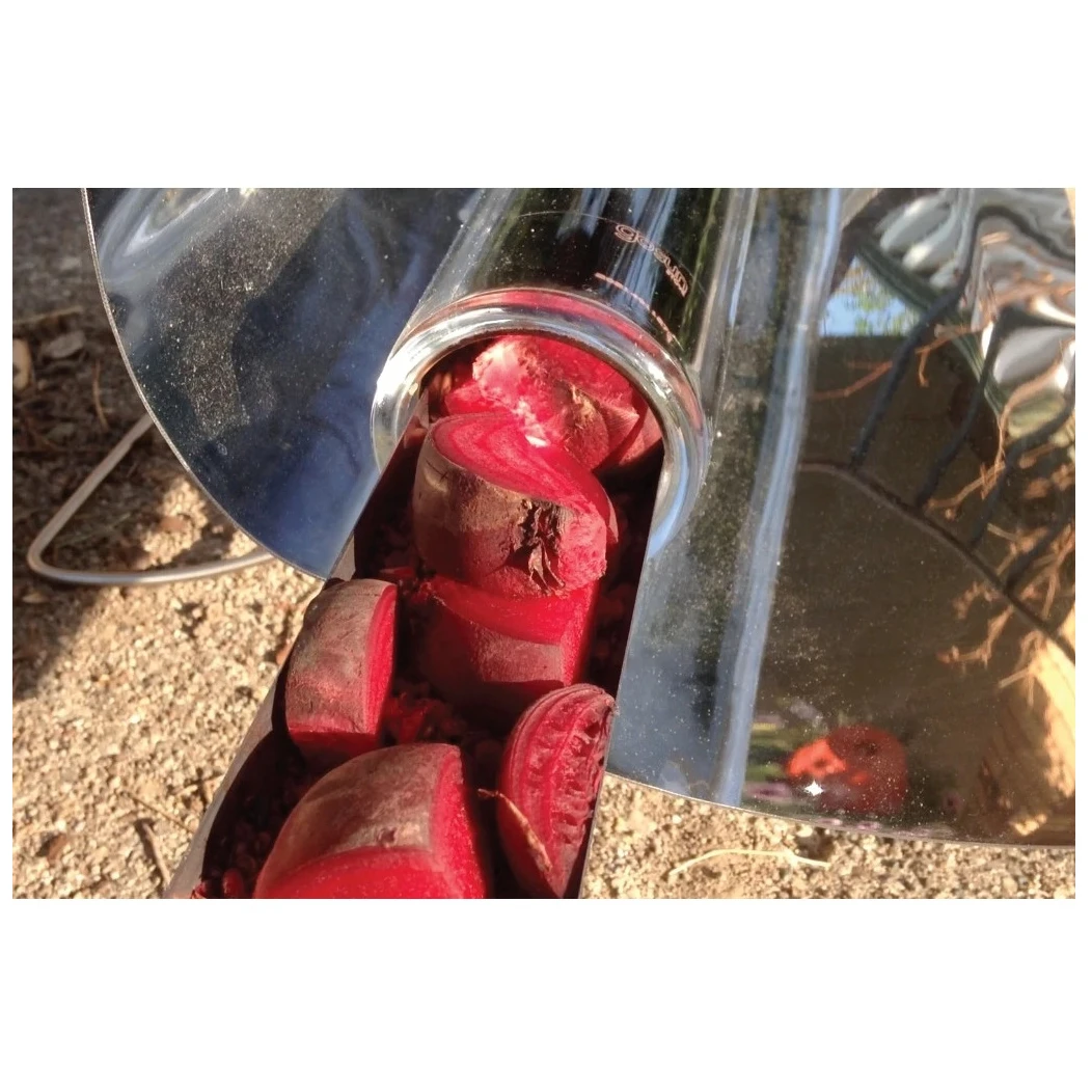 El paquete estándar incluye una duradera cámara de cocción en forma de tubo de cristal de borosilicato, dos reflectores parabólicos que pueden enrollarse para proteger el tubo como una concha, una cubeta de cocción de acero inoxidable, un pequeño conjunto de limpieza de superficie rugosa fijado al extremo de la cubeta, un manual de usuario, un folleto de cocción y asas de acero inoxidable.