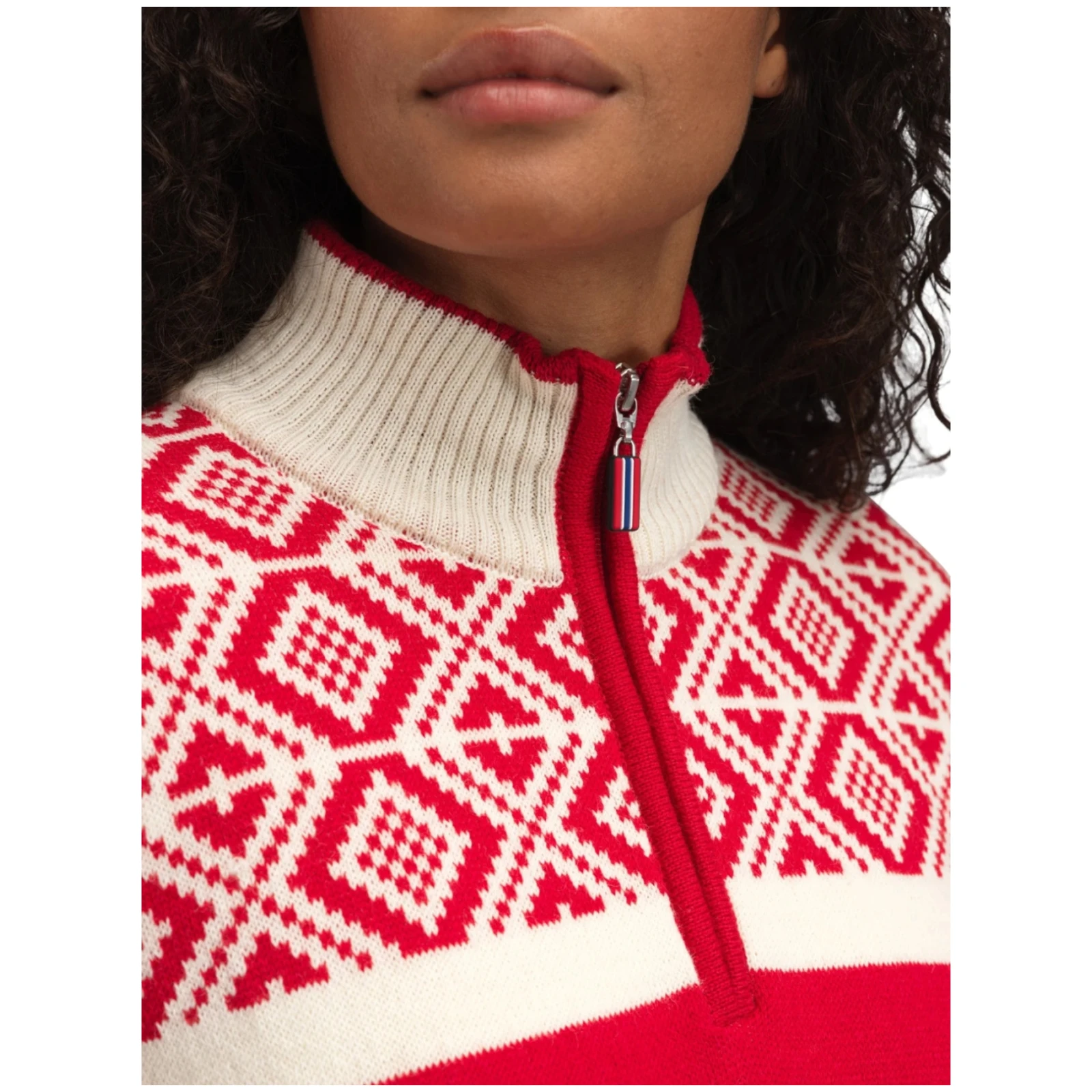 El cuello alto con media cremallera protege el cuello del frío y permite una fácil regulación de la temperatura. El suéter fue diseñado y tejido en Noruega – en el espíritu de la auténtica calidad de la marca Dale of Norway.