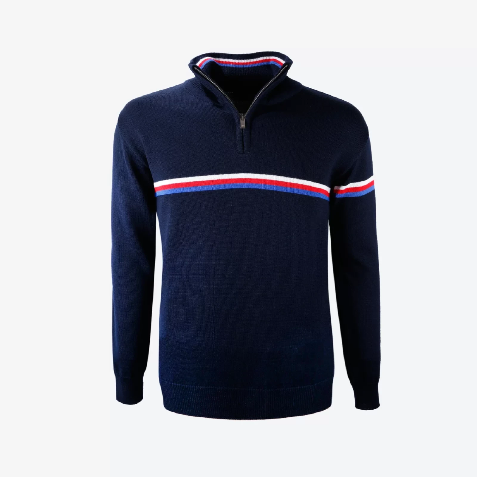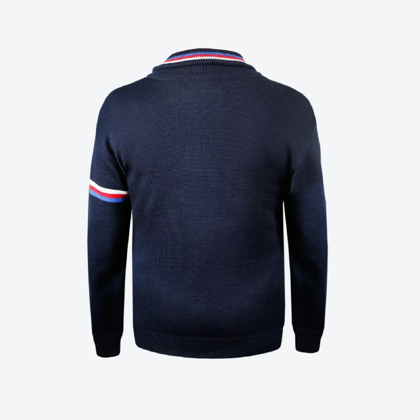 Un elegante jersey liso de lana Merino de primera calidad con un discreto detalle tricolor es la opción ideal para el día a día.