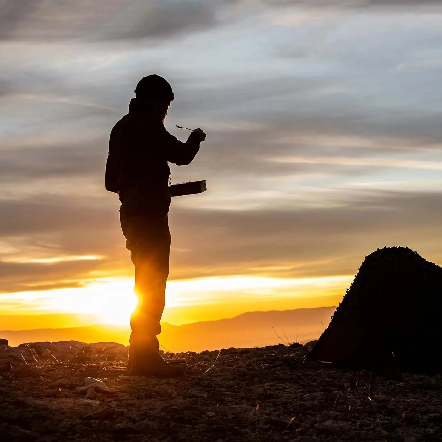 El hornillo utiliza alcohol sólido en forma de pastillas, que proporcionan un rendimiento fiable incluso en climas fríos o a mayores altitudes. El soporte estable de aluminio anodizado ligero se adapta perfectamente al recipiente y se puede guardar en su interior, ahorrando espacio durante el transporte. Un detalle práctico es también el gancho en la tapa, gracias al cual puede colgarla en el borde del recipiente y tener las manos libres mientras cocina.