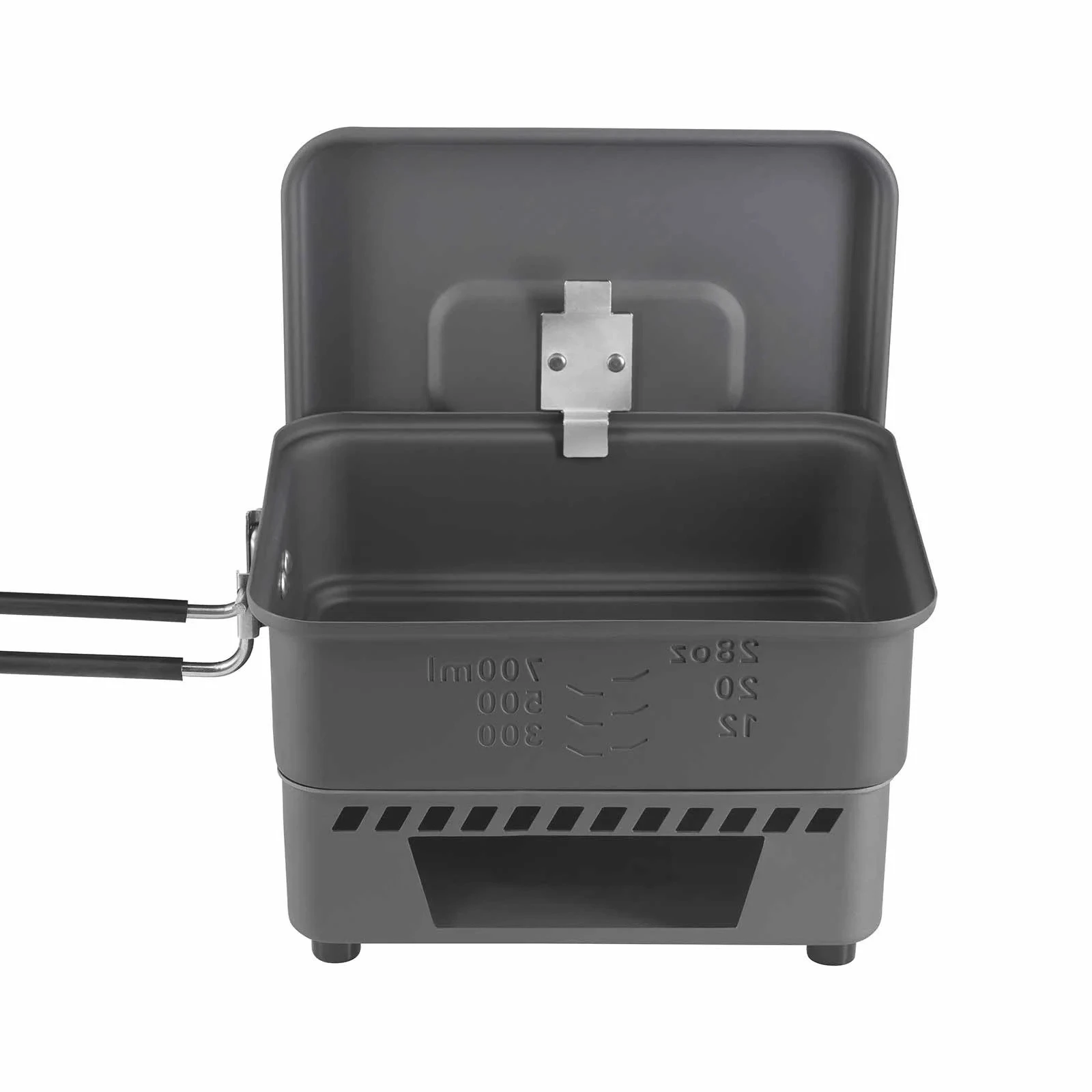 El recipiente con una capacidad de 1,1 litros está fabricado en aluminio anodizado endurecido, que ofrece bajo peso y buena resistencia para uso en exteriores. Un práctico medidor en ml y oz facilita la cocción, mientras que el asa plegable con revestimiento de silicona garantiza un manejo seguro incluso a temperaturas más altas.