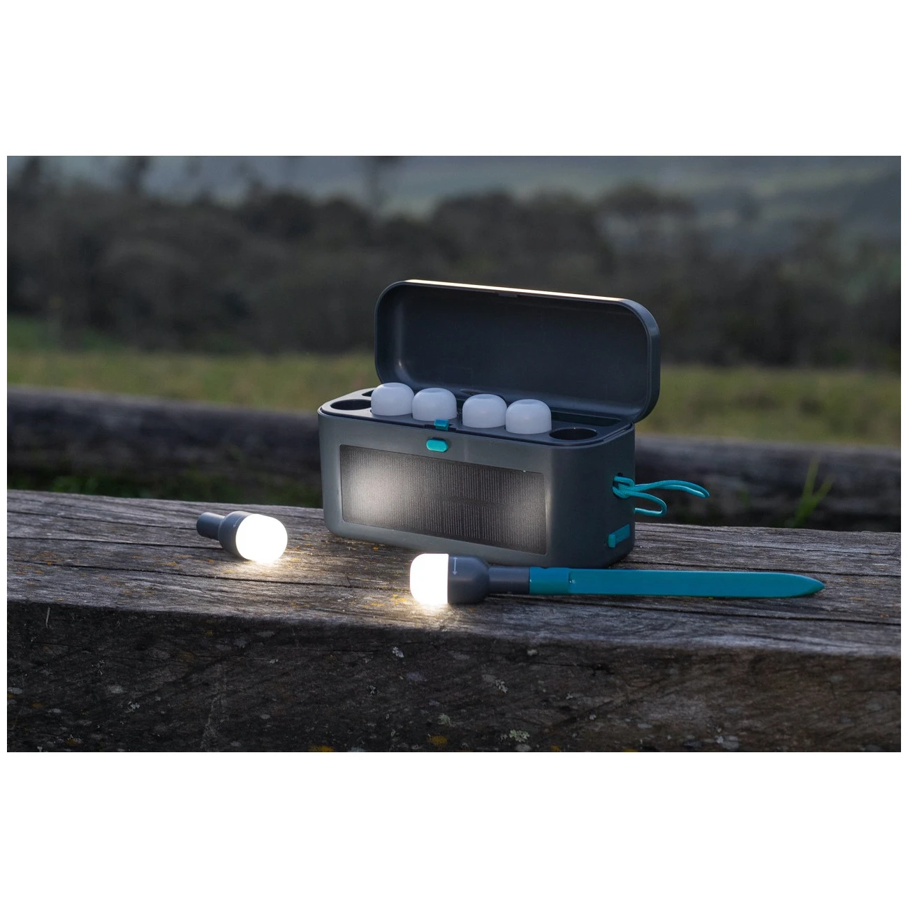 Con 6 luces colgantes, 6 estacas de plástico ABS y 1 estuche de carga para guardar las bombillas, las luces Site Lights iluminarán cualquier escena hasta por 20 horas con una sola carga.