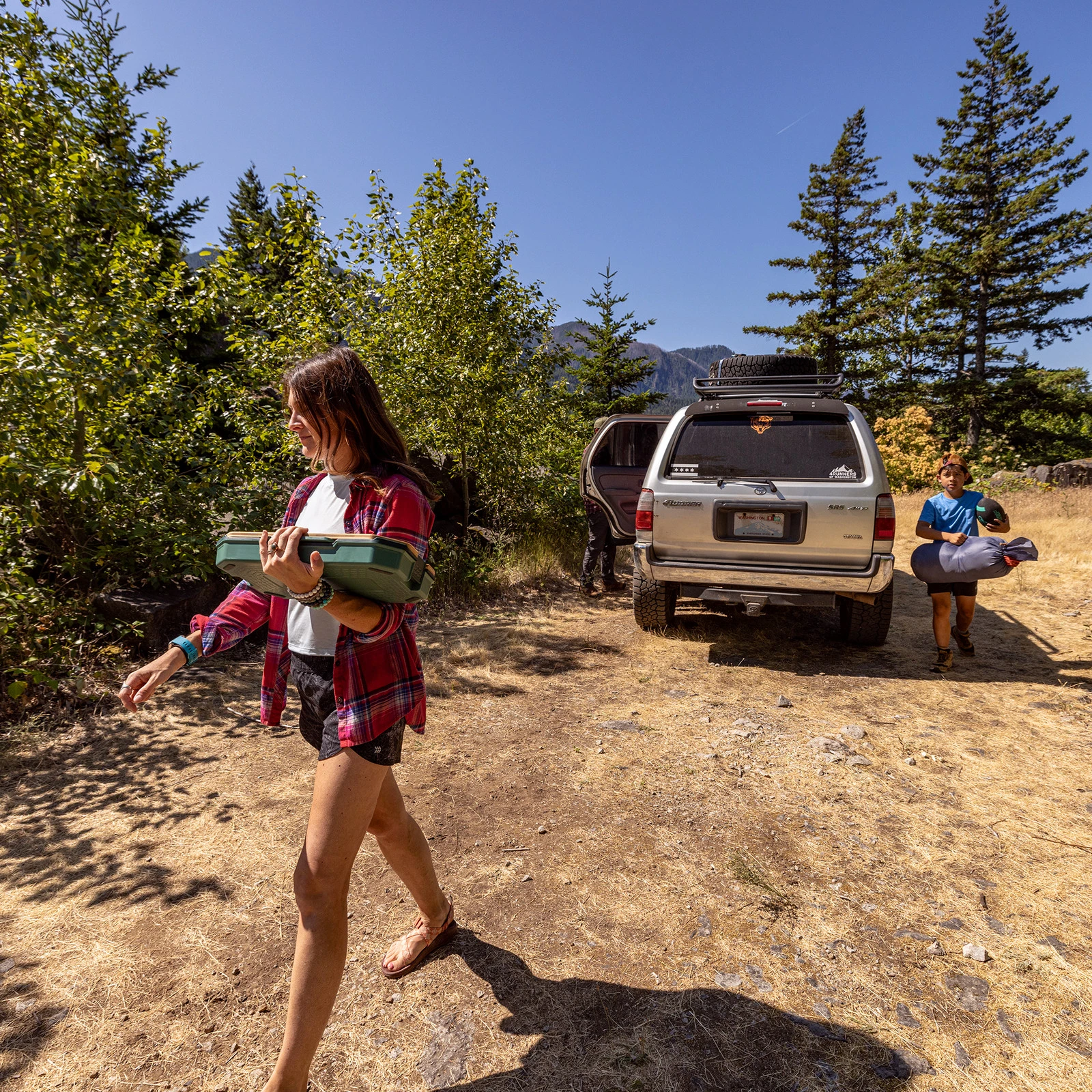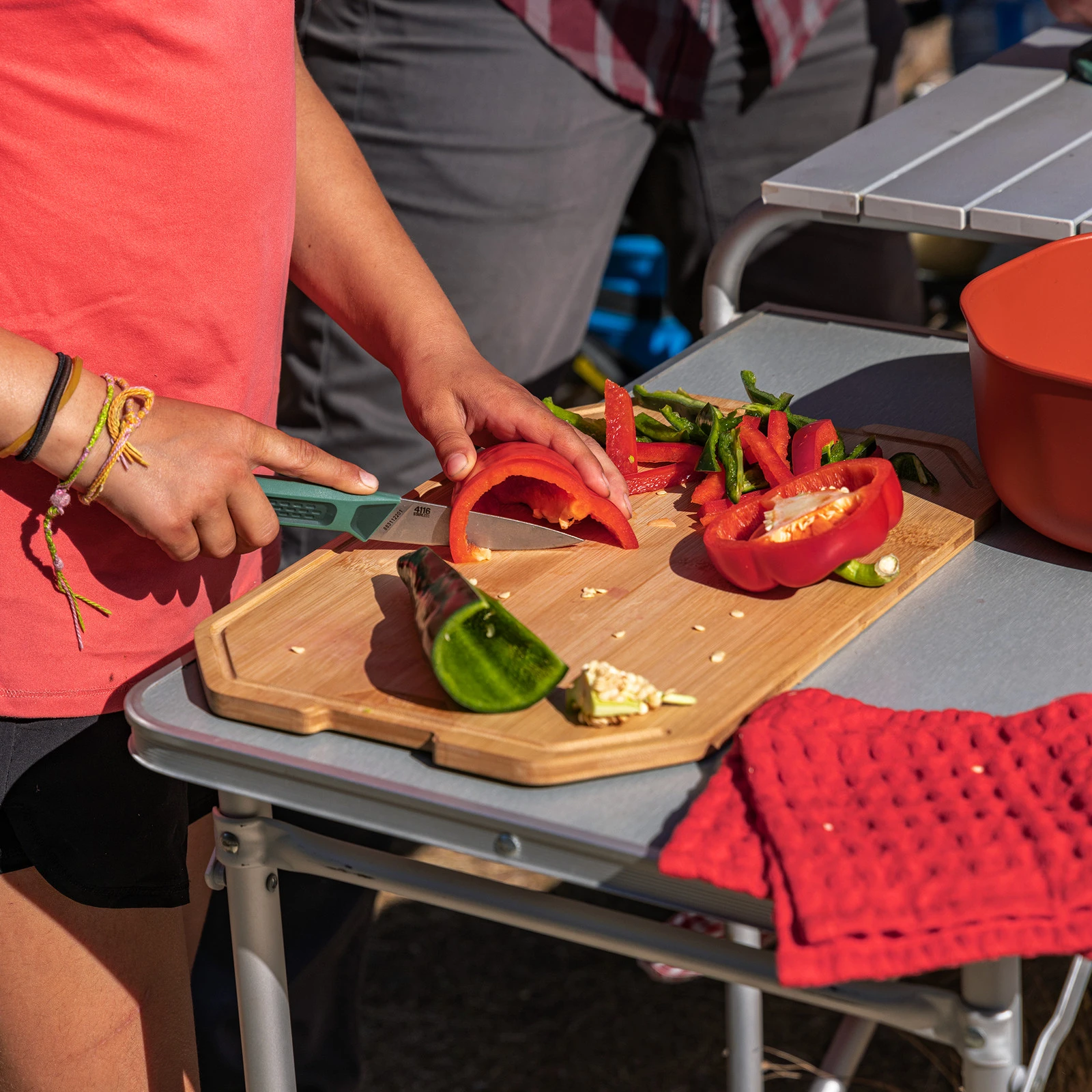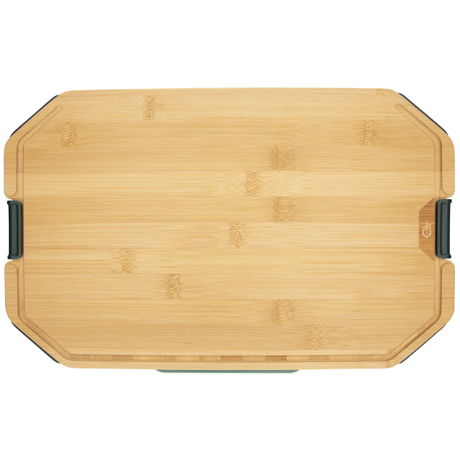 El juego completo de tablas de cortar Gerber incluye dos tablas de cortar de bambú y polipropileno de doble cara, un cuchillo para bordes de 8,25 cm, un cuchillo de chef de 15 cm y una bandeja de almacenamiento. Cuando llega el momento de recoger el campamento, todo queda compacto.