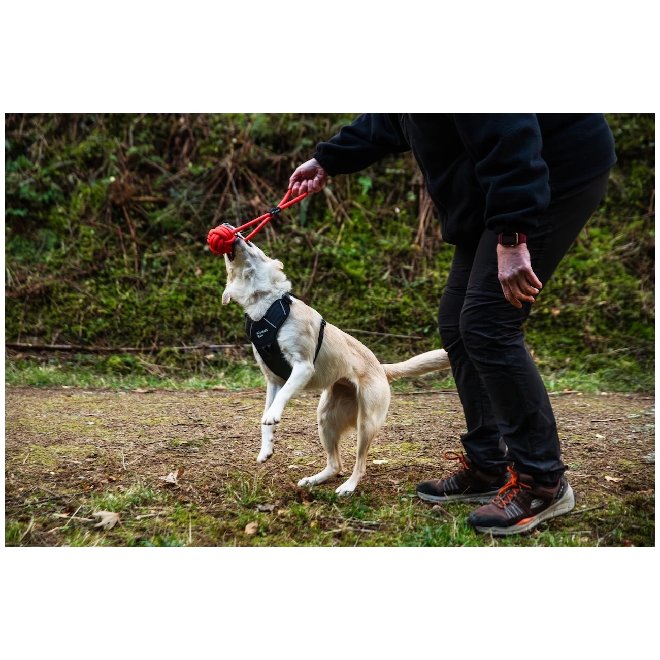 La forma de la pelota hace que vuele de maravilla. El material de alta resistencia resiste los dientes y la fuerza de un perro grande. De hecho, está fabricado con una cuerda de escalada de 11 mm de grosor que permite tirones intensos, lo que fortalece perfectamente la relación entre el perro y el dueño. Se sujeta bien gracias a su asa resistente. La cuerda tiene elementos reflectantes, por lo que la encontrarás mejor incluso en la hierba alta.