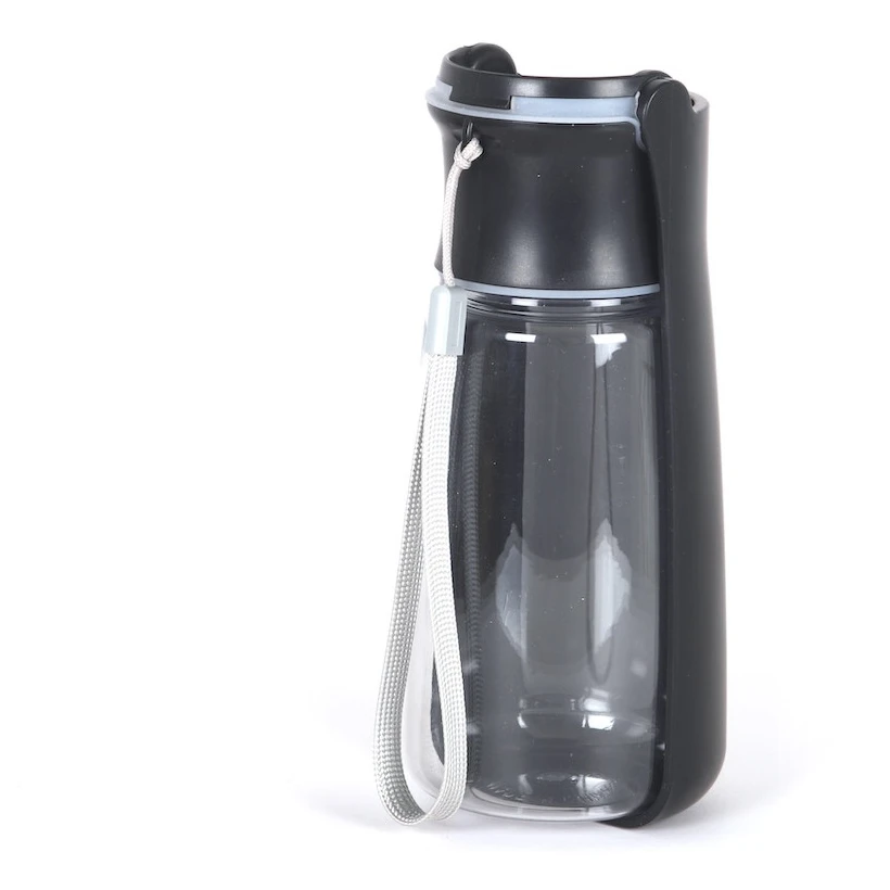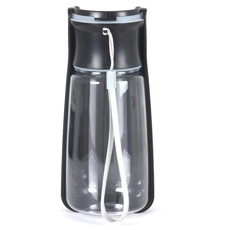 La botella está hecha de plástico resistente y, una vez desplegada, la tapa forma un cuenco para beber. El dispensador de agua se activa con un botón. El asa permite colgarlo de la muñeca o de la mochila. La botella es fácil de mantener limpia.