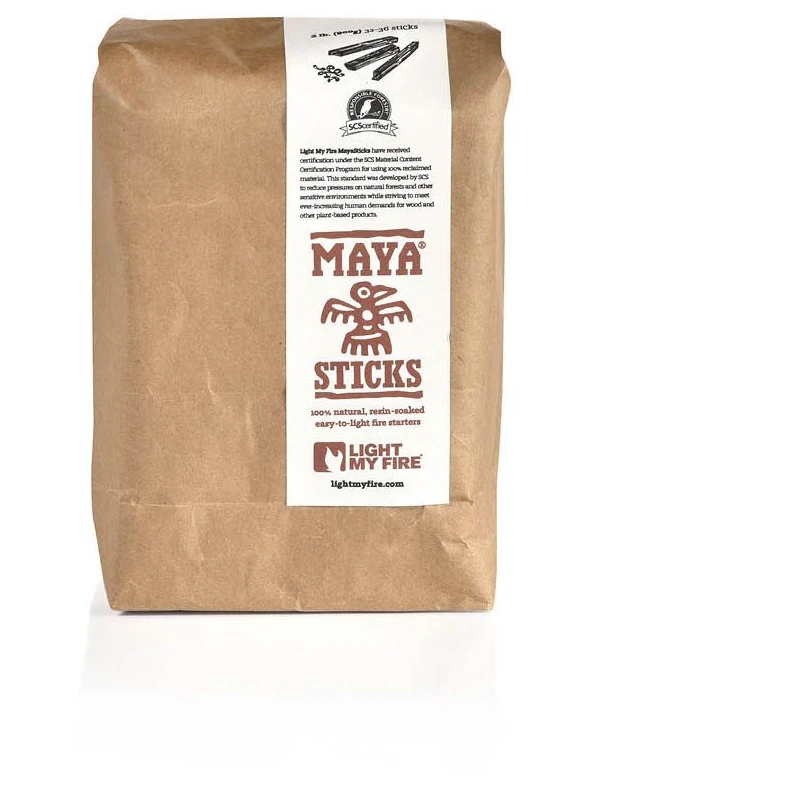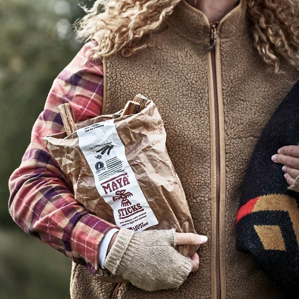 Encender y mantener el fuego con MayaSticks. Envuelto en una bolsa de papel inflamable y fabricado con tocones de pino de Honduras. Los troncos se encienden fácilmente incluso cuando están húmedos y producen un calor intenso. ¡Y huele genial!