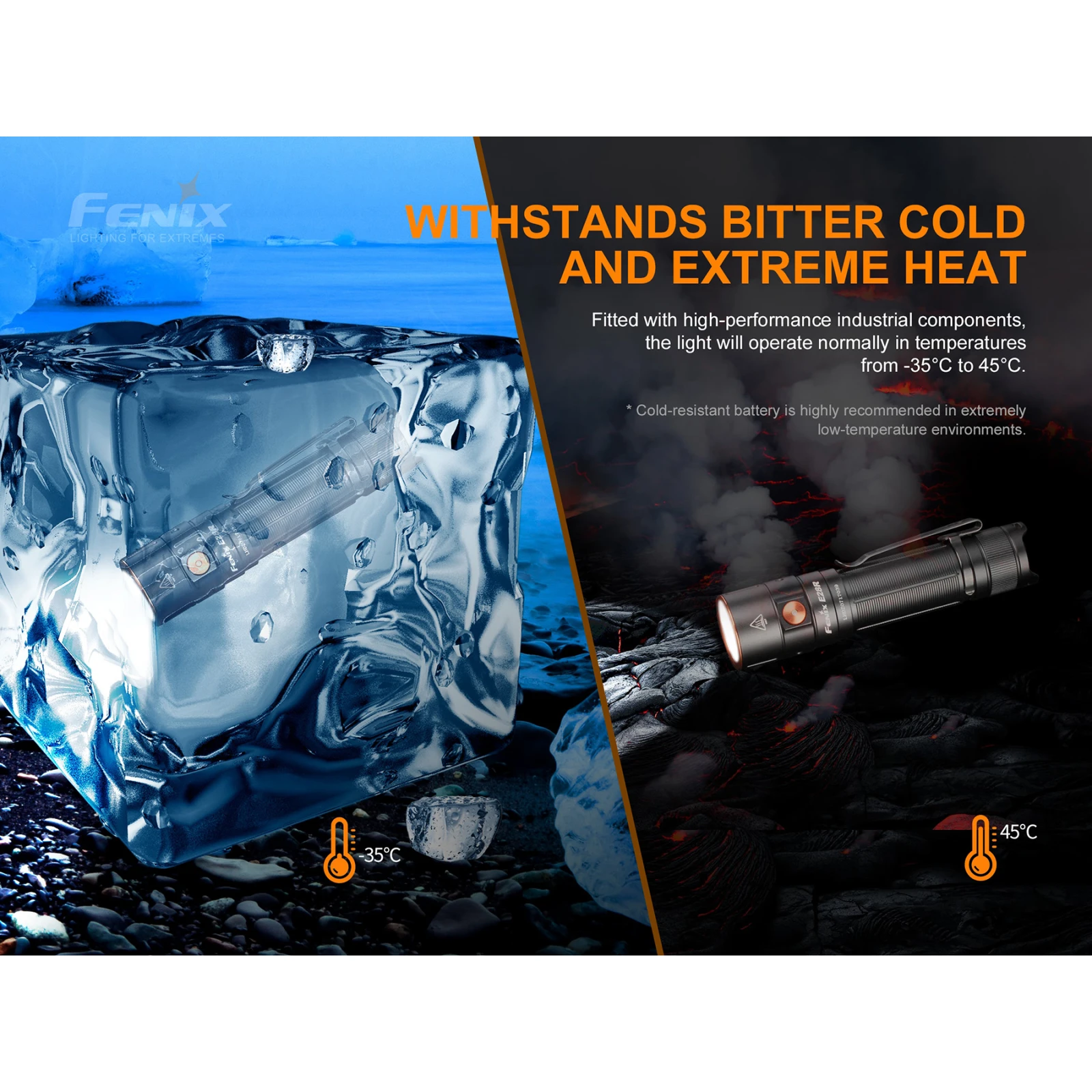 La linterna recargable Fenix está hecha de aluminio endurecido de calidad aeronáutica y tiene un acabado duradero. Las roscas trapezoidales con mayor resistencia al desgaste también son una ventaja. Por supuesto, es resistente a caídas desde una altura de hasta 1 metro, resistente al agua y al polvo según la norma IP68 (probado bajo el agua a una profundidad de 2 metros). El peso de la linterna es de 115 gramos, incluida la batería.