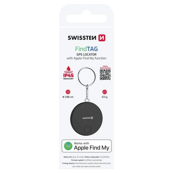 Swissten Find Tag es un localizador inteligente compacto que te ayudará a encontrar rápidamente llaves, carteras, bolsos u otros objetos de valor perdidos. Gracias a la integración en la red Apple Find My, funciona directamente con iPhone y iPad, sin necesidad de instalar aplicaciones adicionales. El zumbador integrado y la localización precisa garantizan que siempre encontrarás tus pertenencias fácilmente, incluso en condiciones difíciles. El cuerpo duradero de plástico ABS con clasificación IP45 y una batería de larga duración de hasta 15 meses hacen del Find Tag un compañero fiable para el día a día.