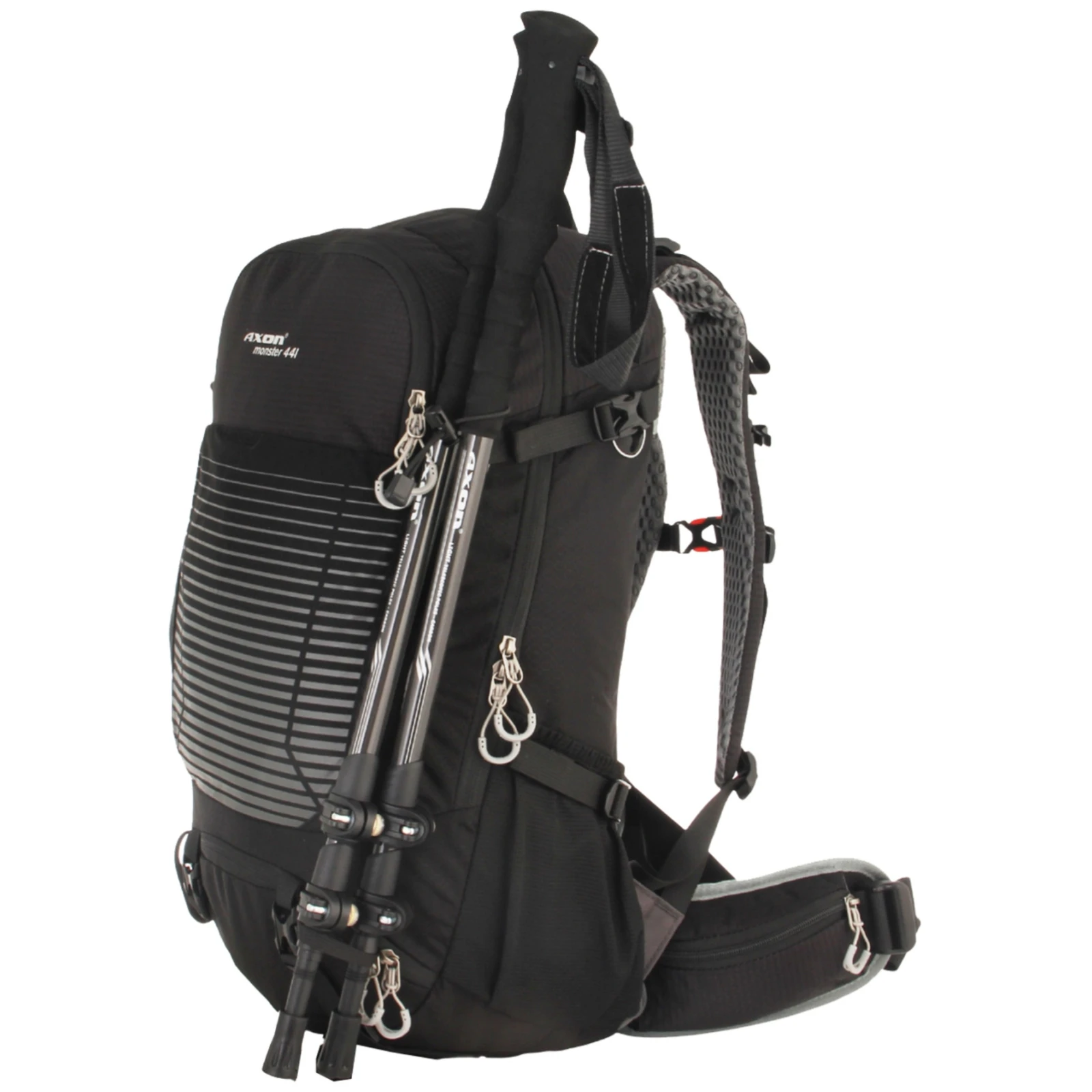 La mochila Axon Monster es una mochila de uso universal para excursiones de senderismo exigentes de uno o varios días. Tiene espalda acolchada ventilada Airconntact con cinturón lumbar acolchado con bolsillos con cremallera.