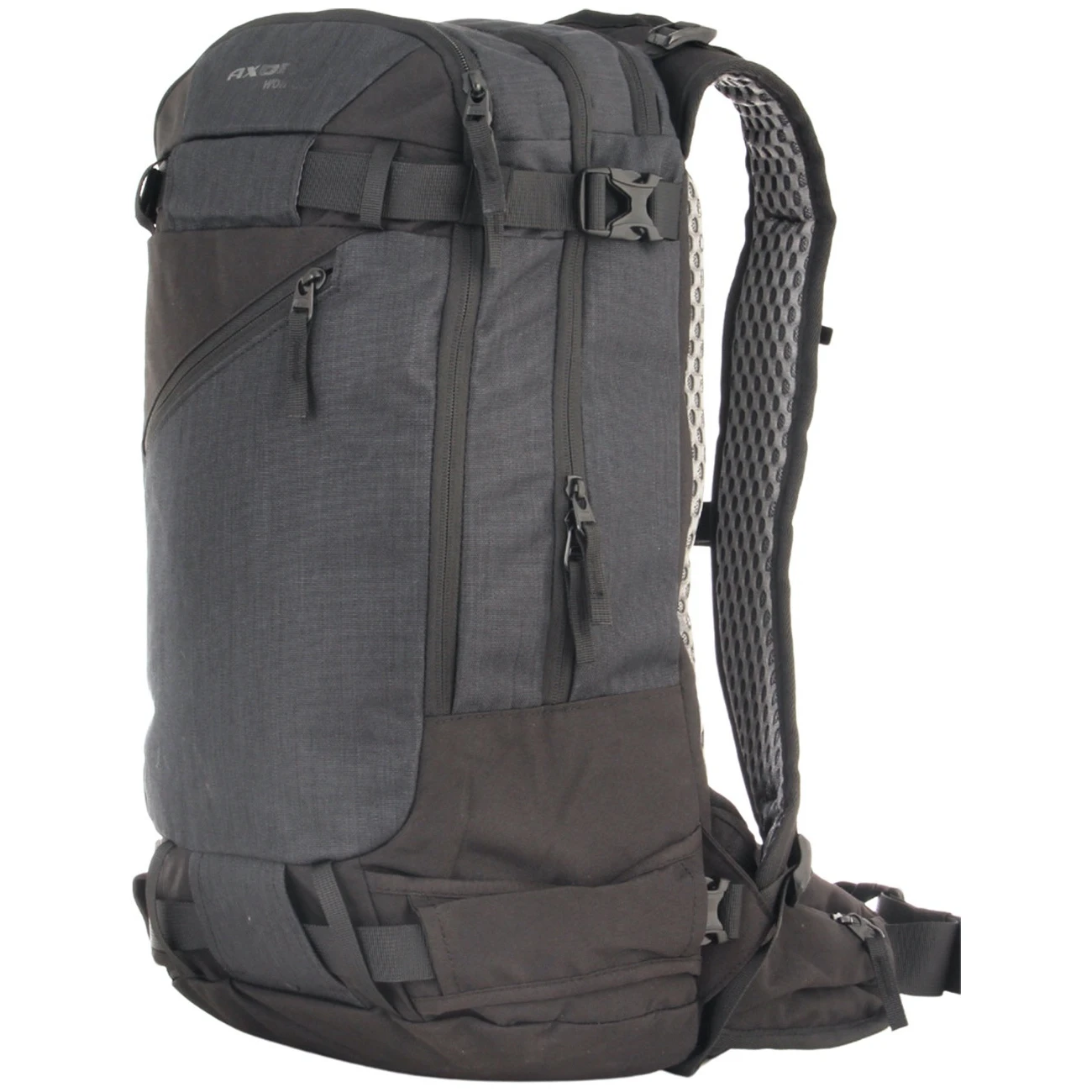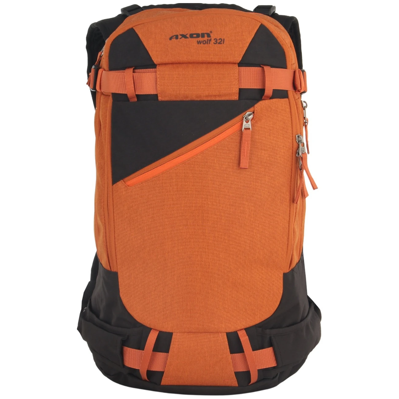Mochila deportiva WOLF de Axon con espalda ERS acolchada y ventilada. Las correas de los hombros con acolchado reforzado tienen forma anatómica con correa de pecho ajustable en altura con silbato, la correa lumbar asegura un ajuste firme y cómodo de la mochila en tu espalda. La mochila tiene un compartimento principal grande y un compartimento frontal profundo con cremallera, un compartimento frontal y un compartimento superior con cremallera para objetos pequeños. Los esquís se pueden sujetar a los lados de la mochila. La mochila está adaptada para una bolsa de agua.