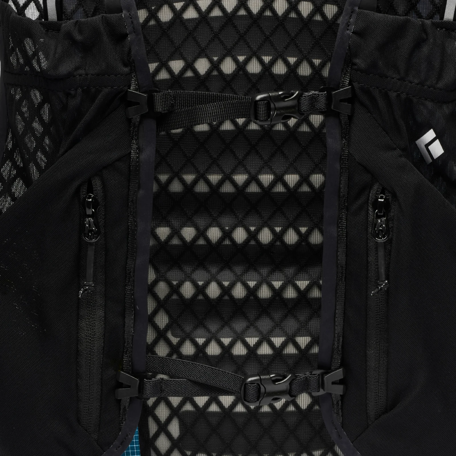 Construcción híbrida con un sistema de porte tipo chaleco asegura un ajuste seguro y libertad de movimiento incluso durante la actividad dinámica. La tecnología BD SETT (Stitchless Edge Taping Technology) aumenta la comodidad de las correas de los hombros, la durabilidad y reduce el peso. La malla de diamante transpirable es agradable al contacto con la piel y promueve la comodidad durante todo el día.