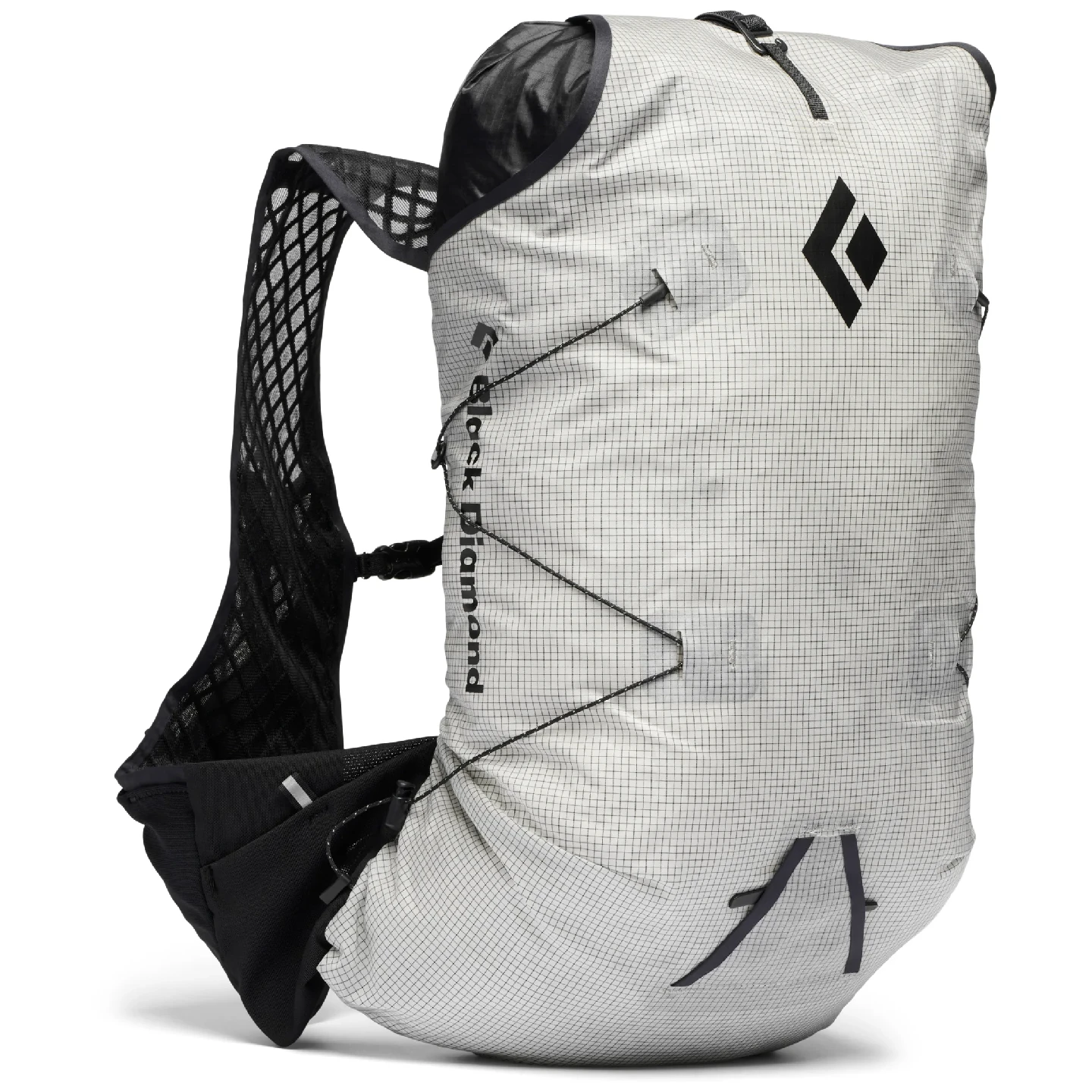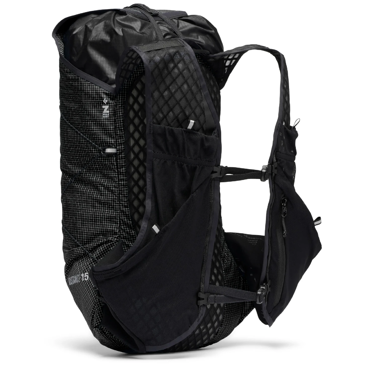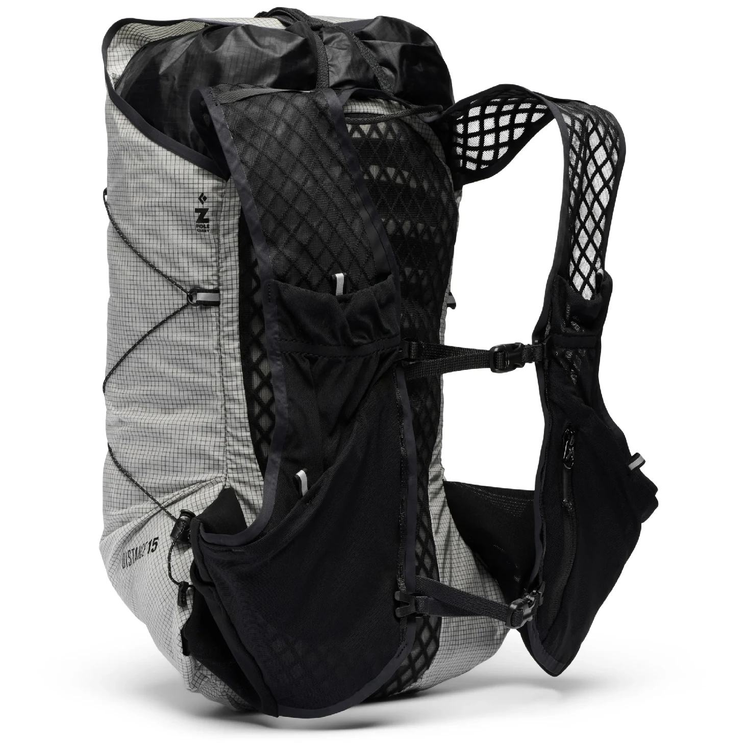 La mochila está equipada con fundas integradas para bastones Z para un uso rápido sobre la marcha, compresión lateral dual para ajustar el volumen, dos bolsillos para bidones blandos (botellas no incluidas), un bolsillo con cremallera y dos bolsillos elásticos en las correas de los hombros. También cuenta con dos bolsillos laterales elásticos, un bolsillo interior con cremallera y clip para llaves, y la opción de acoplar dos piolets. El volumen es de 15 litros y el peso es de aproximadamente 330 g (talla M).