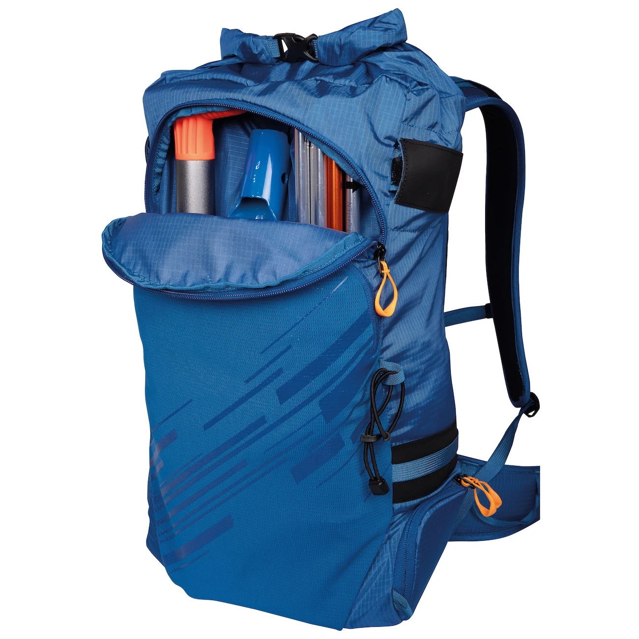 Se puede acceder a la mochila mediante la tapa enrollable con cierre interno y con la amplia abertura Full BackDoor. En el interior hay un bolsillo para la bolsa de hidratación y un bolsillo interior con un mosquetón para las llaves. El bolsillo delantero elástico permite guardar objetos mojados.
