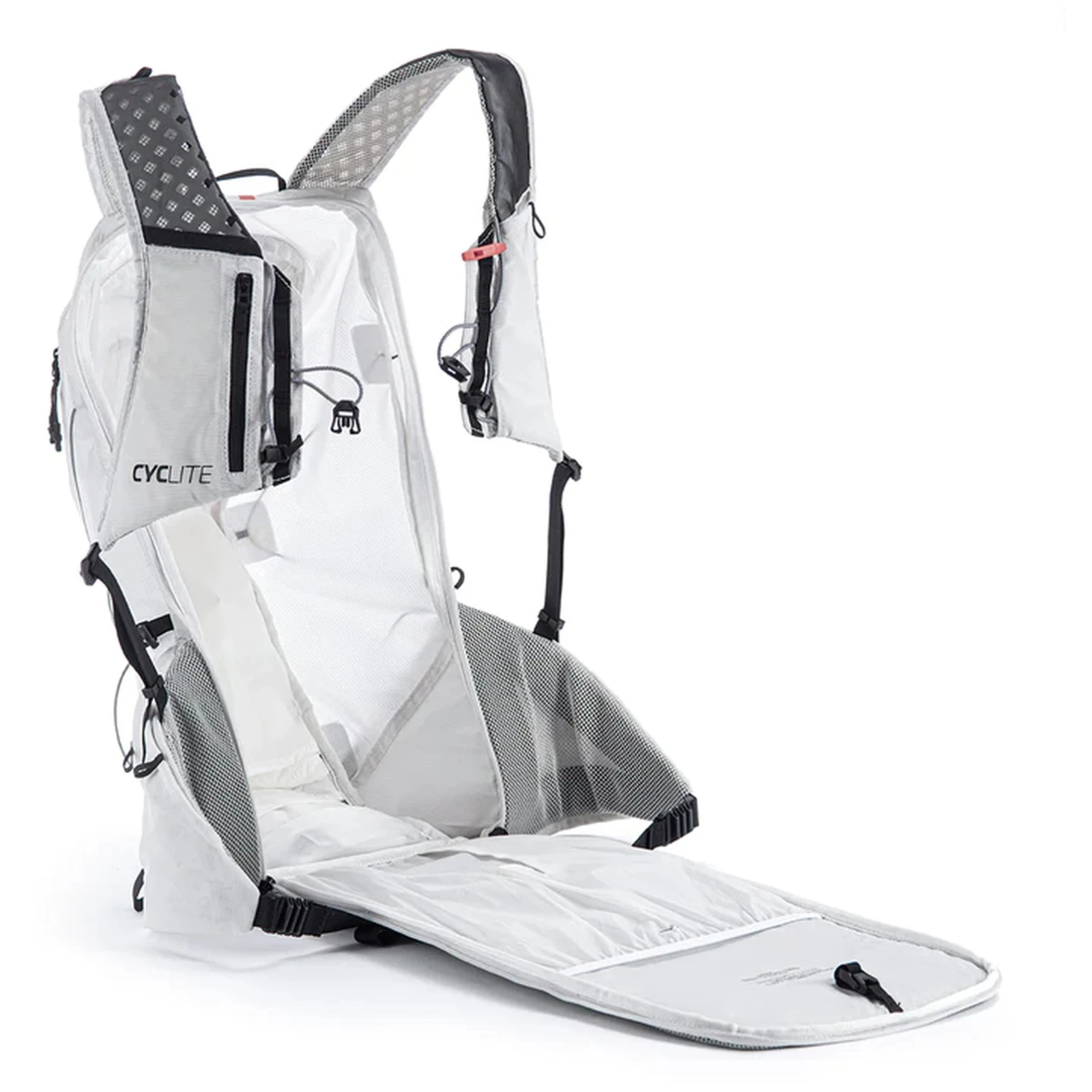 La mochila Touring Backpack de la marca Cyclite es una mochila de ciclismo ingeniosamente diseñada que ofrece funciones completas de mochila de senderismo con un peso extraordinariamente bajo de solo 578 g. Sin funda para la lluvia ni red para el casco, pesa incluso solo 529 g, lo que la convierte en una opción ideal para viajes de varios días y aventuras más largas donde cada gramo y la máxima funcionalidad importan.