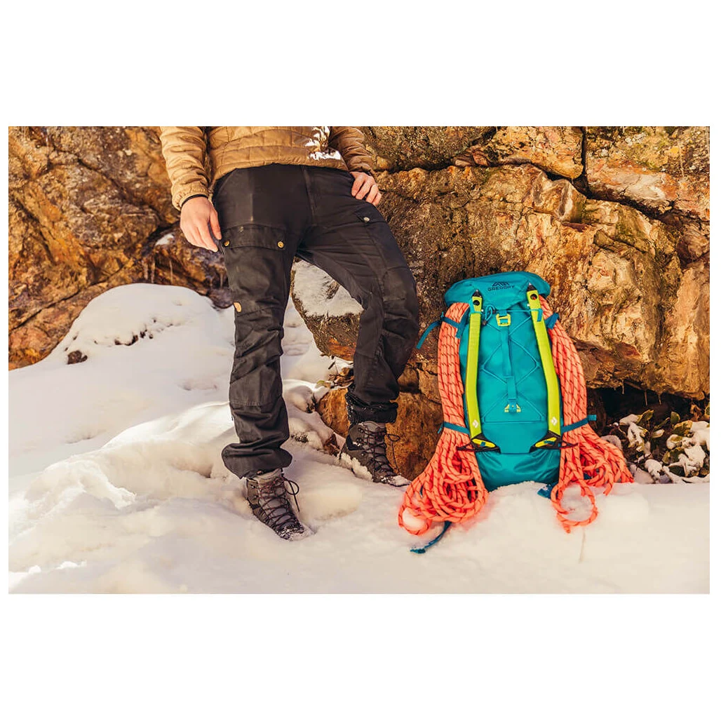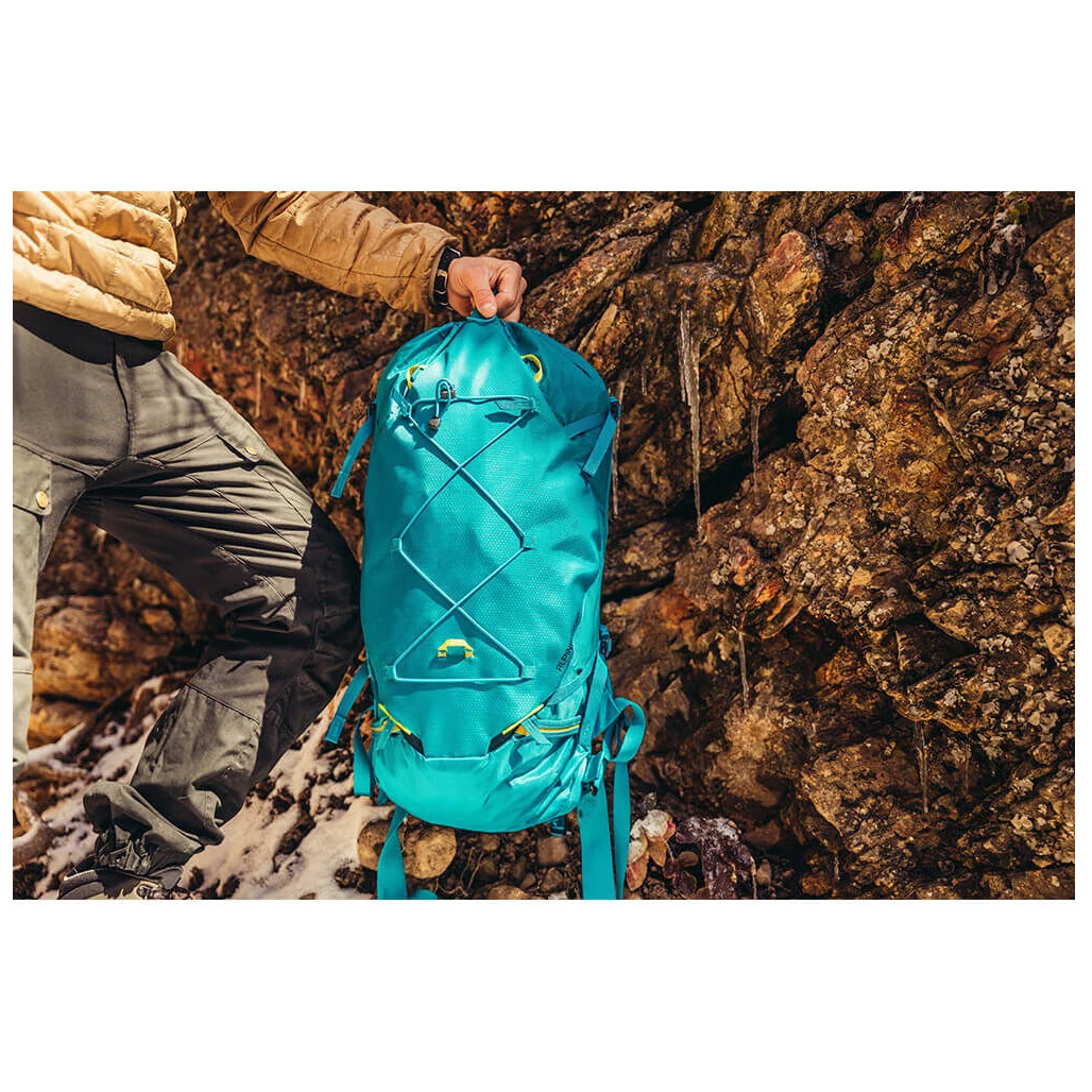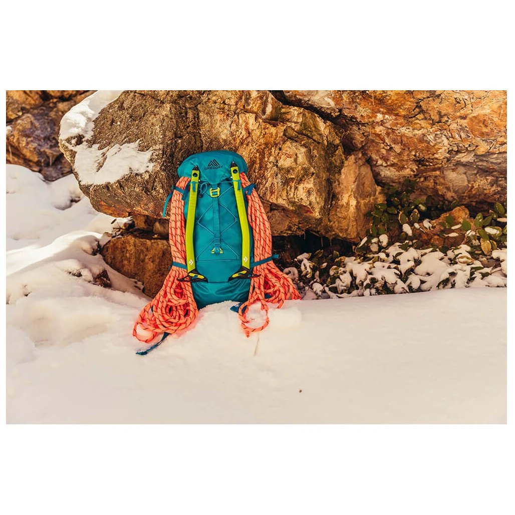 La mochila de escalada universal Gregory Alpinisto 28 LT tiene un sistema de respaldo acolchado muy cómodo FusionLite, que es resistente al agua y a la nieve y mantiene la espalda caliente, con un marco de HDPE extraíble. Los tirantes de EVA son ligeros y flexibles. El sistema Bungee sujeta equipos voluminosos como crampones o ganchos de nieve. La mochila también dispone de asas fiables y reforzadas para fijar cuerdas o sujetar esquís de forma fiable en la configuración en A.