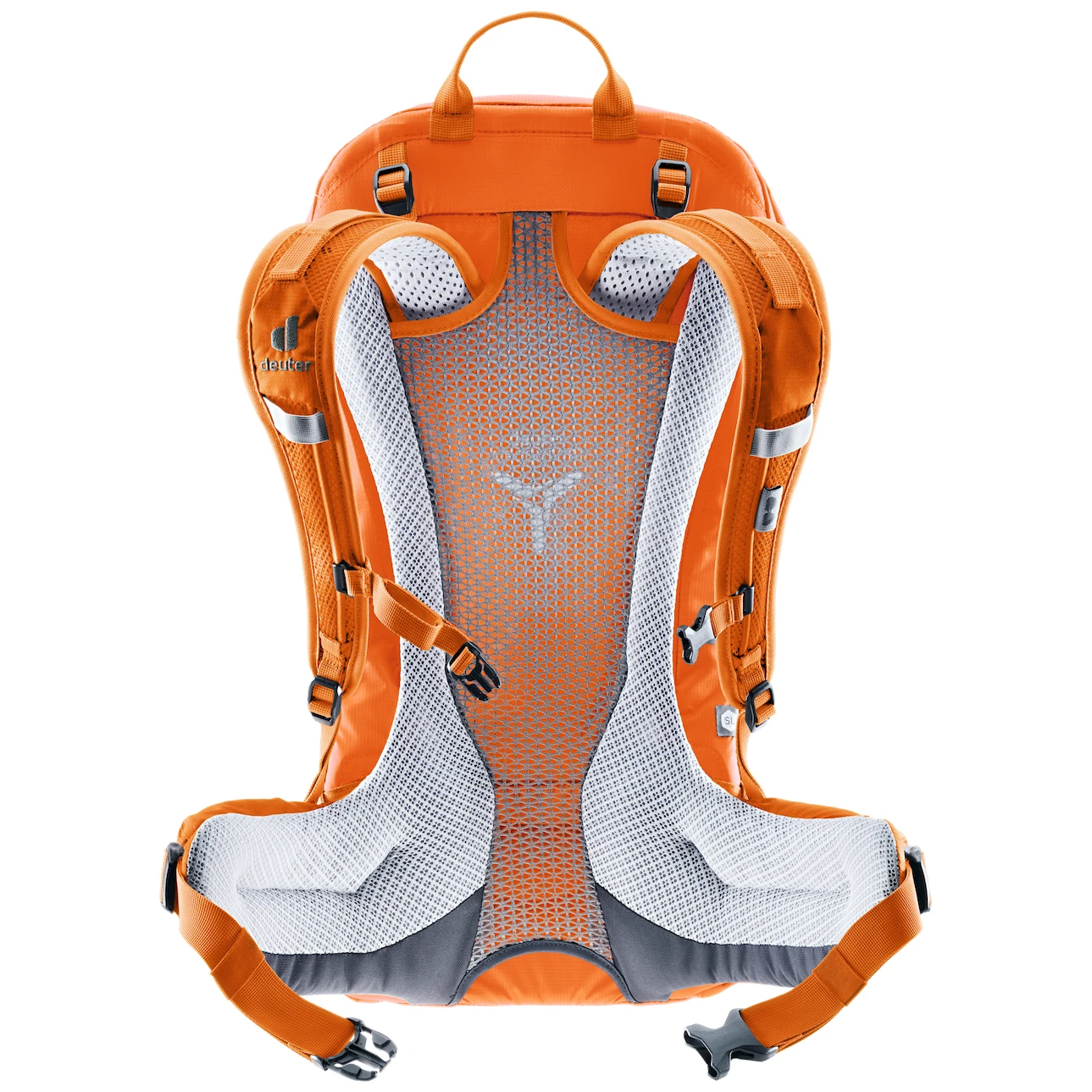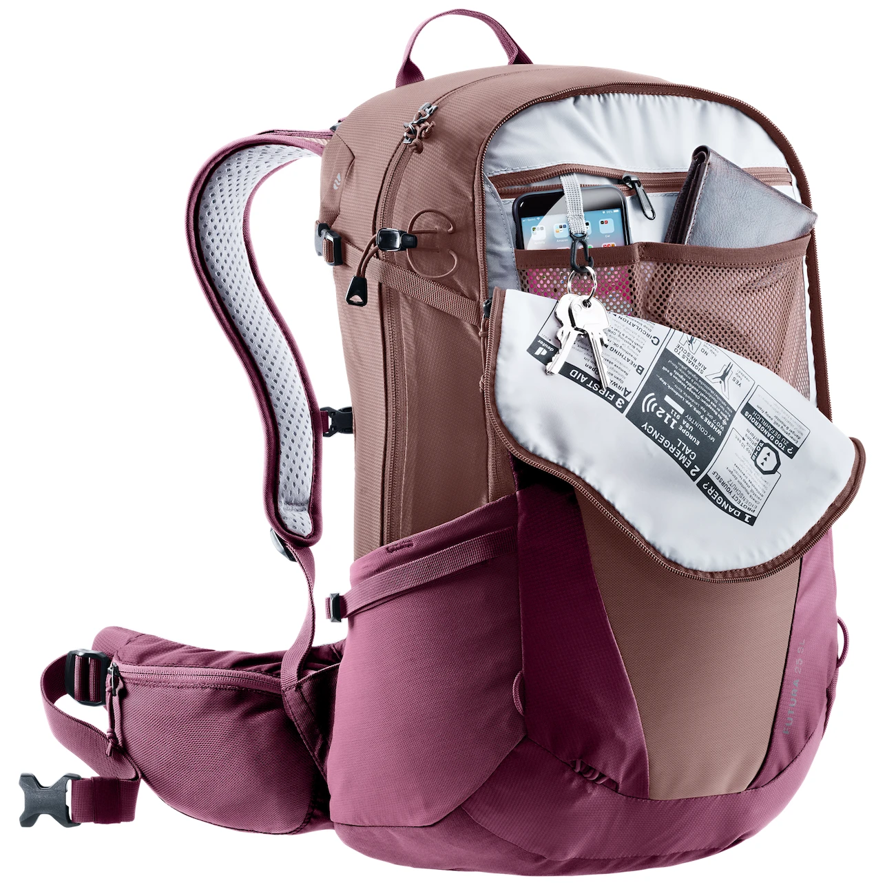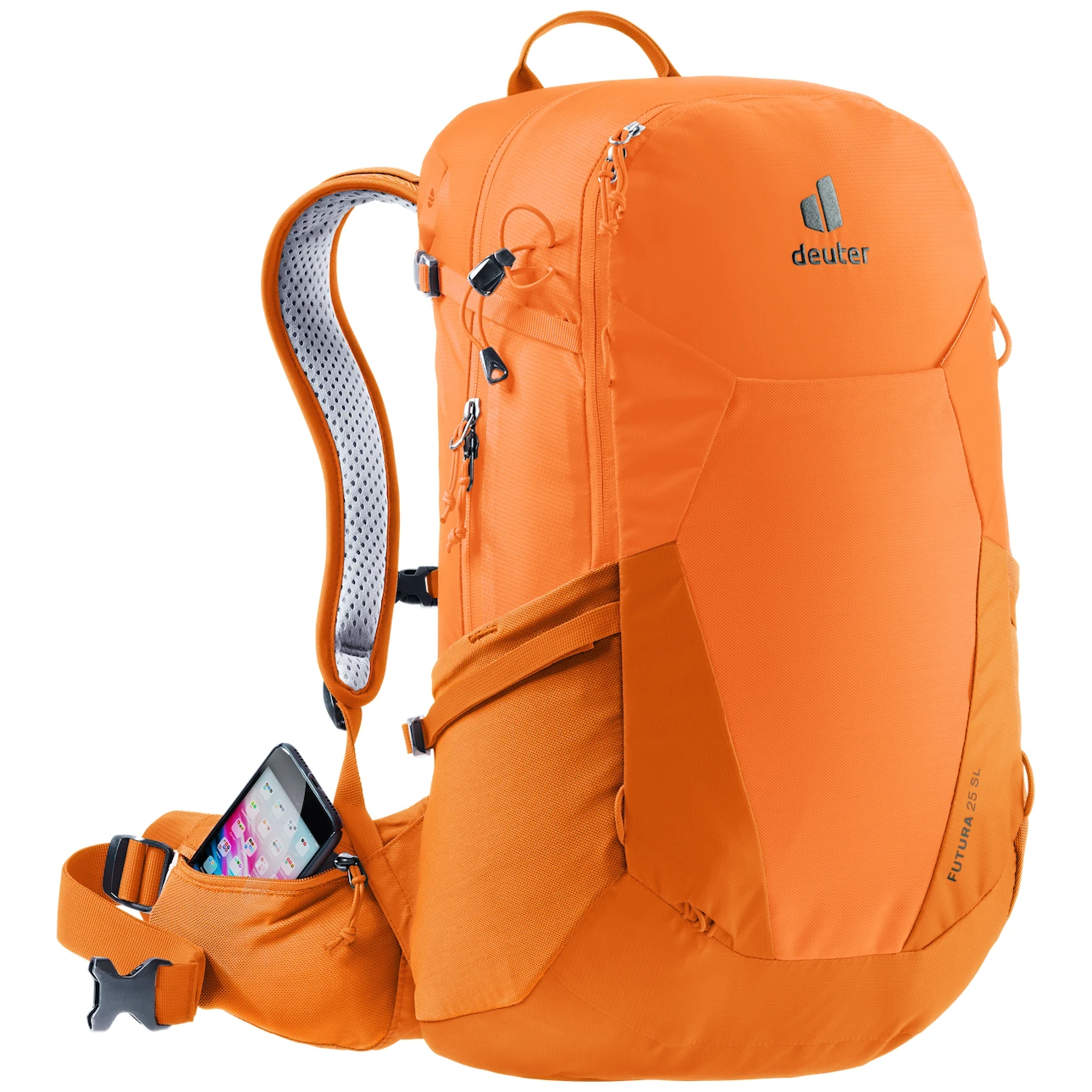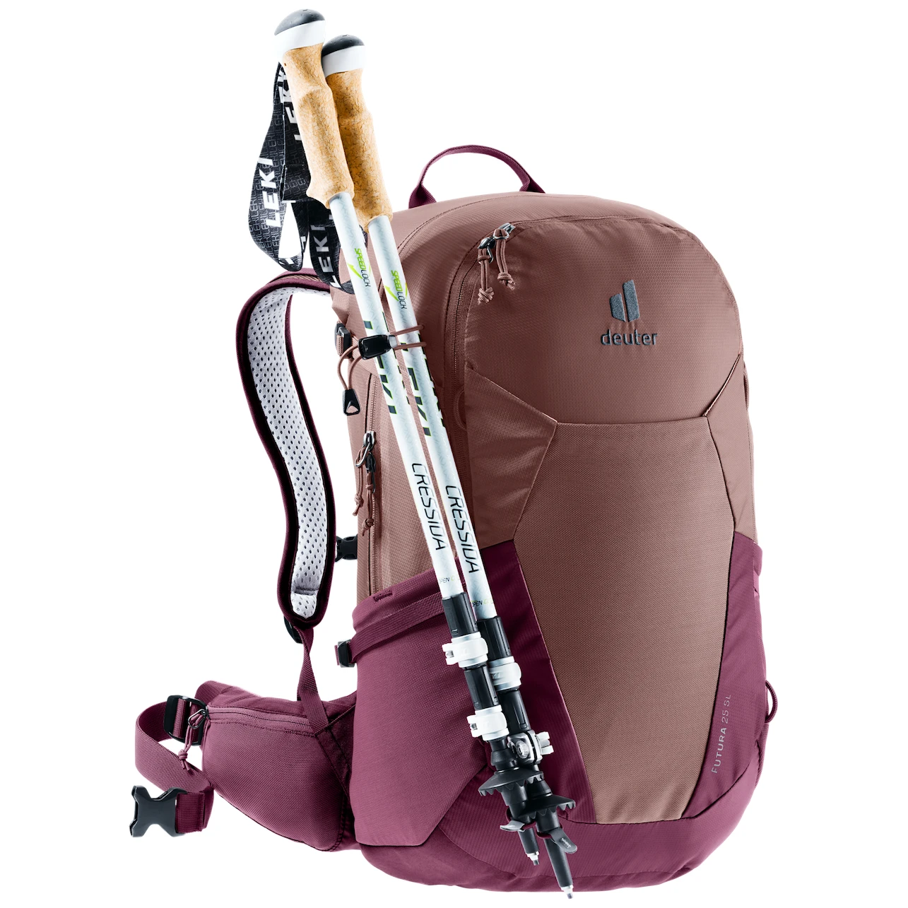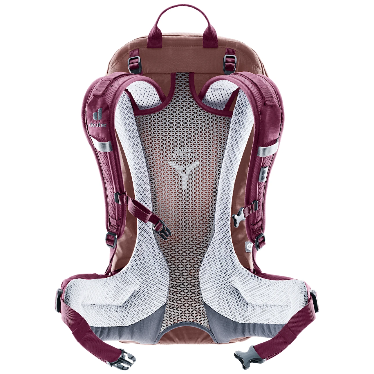 Mochila de senderismo para mujer La mochila Futura 25 SL de Deuter con un volumen de 25 litros está especialmente diseñada para mujeres como una opción ideal para paseos por la montaña o el bosque. Esta ligera mochila técnica incorpora un refuerzo metálico para distribuir el peso y proporciona ligereza y comodidad en los desplazamientos gracias a los tirantes acolchados más estrechos. La mochila tiene una espalda más corta y aletas lumbares cónicas para un ajuste seguro alrededor de la espalda. La mochila está especialmente diseñada para mujeres con el nuevo sistema de espalda Aircomfort que proporciona la máxima circulación de aire para una espalda seca.