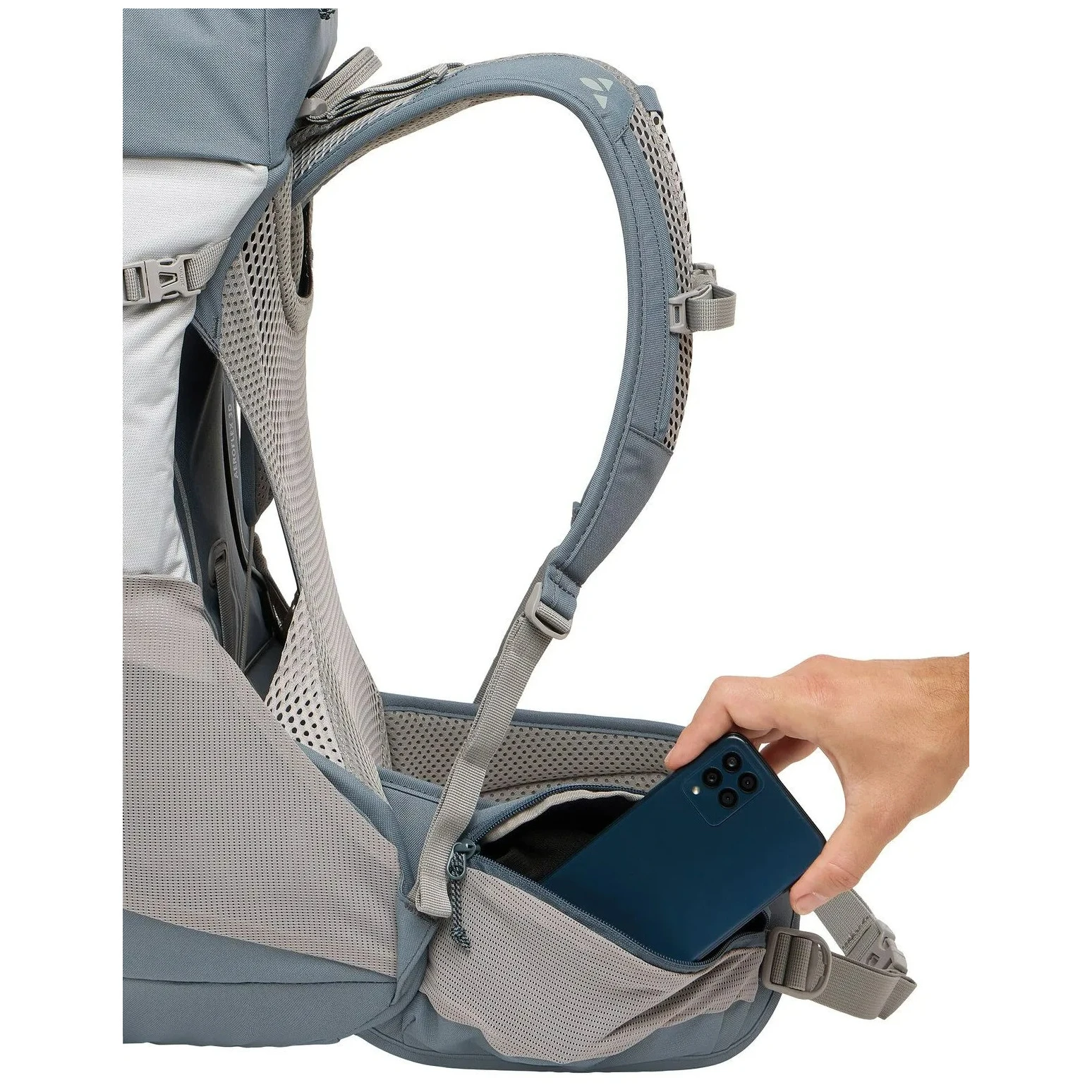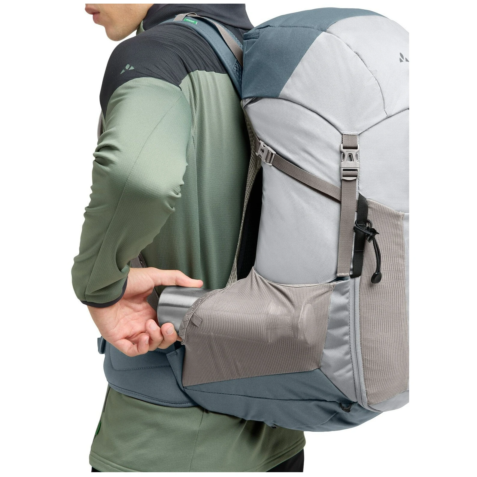 Las aletas de cadera con bolsillo con cremallera garantizan estabilidad y un transporte seguro de la carga. El material Eco Finish es resistente al agua y a la suciedad sin PFC y está fabricado con PET reciclado. La etiqueta VAUDE Green Shape garantiza una producción ecológica y funcional.