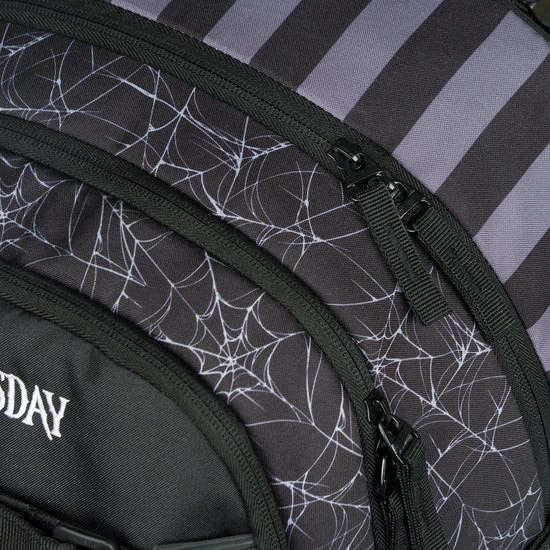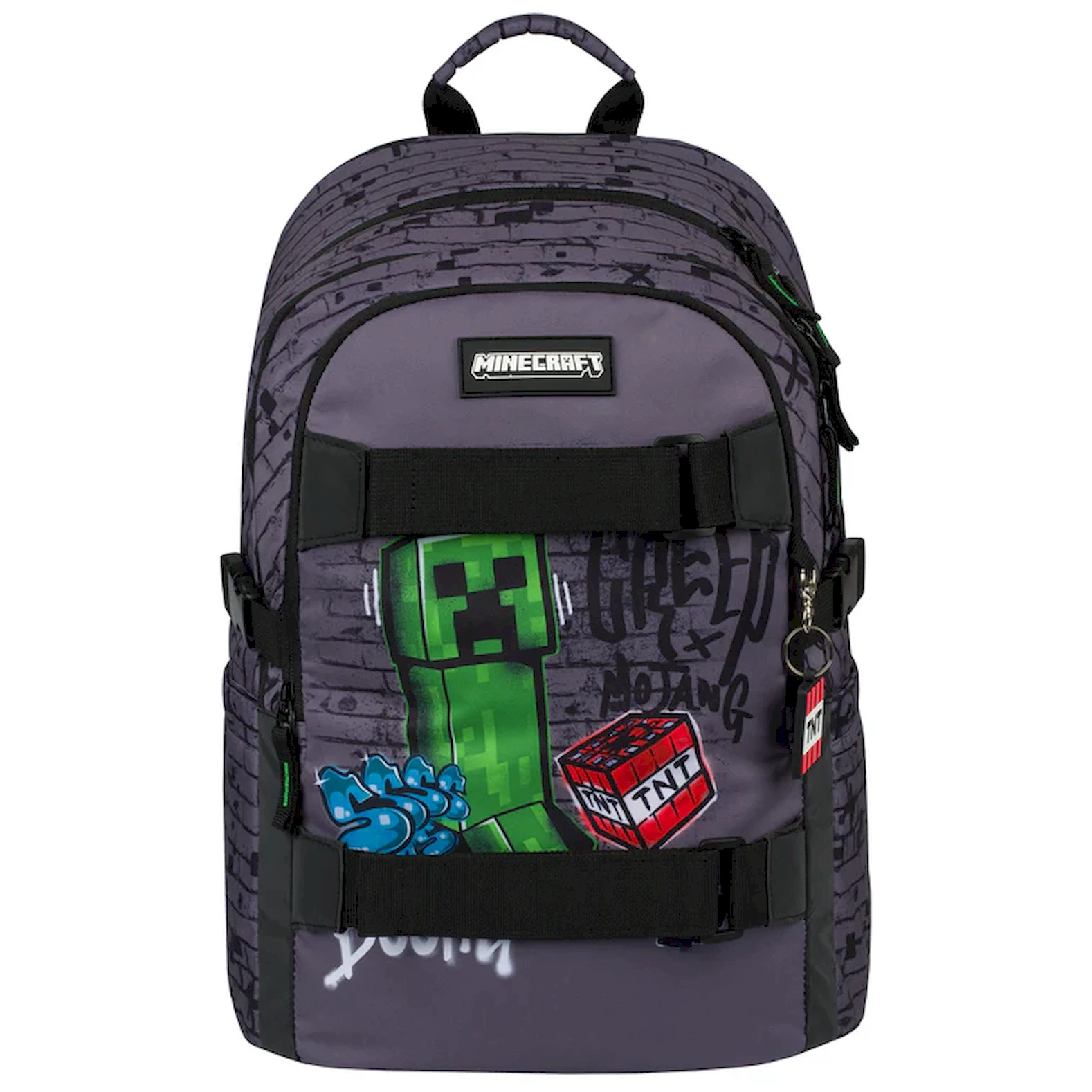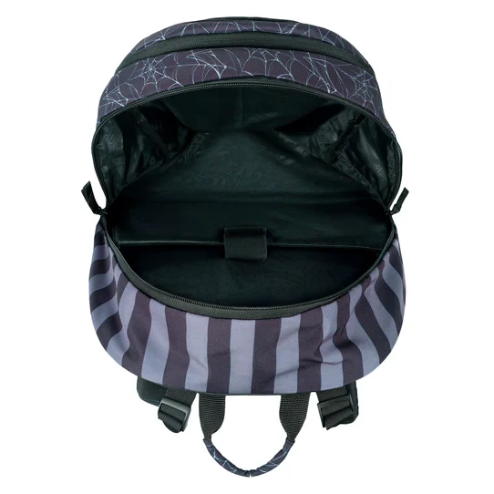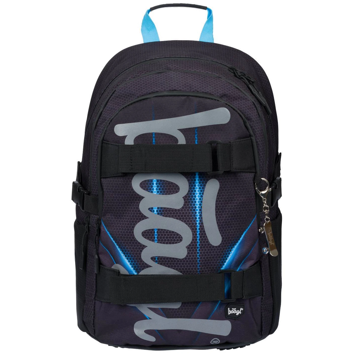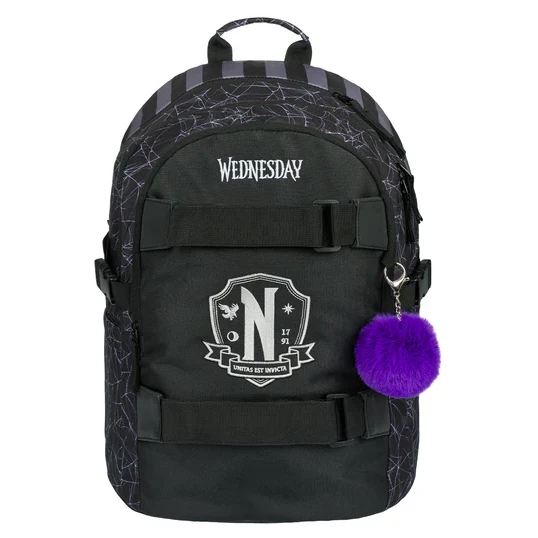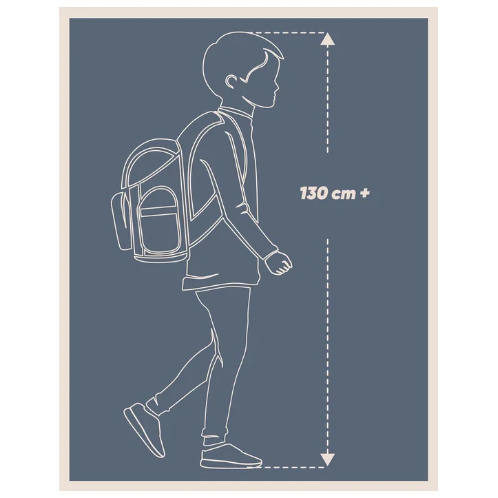 La mochila está fabricada con un material resistente e impermeable. Tiene tres compartimentos separados con cremallera. En el interior hay un práctico organizador y un bolsillo para un portátil de 15" o una tableta. Dos bolsillos laterales de malla son ideales para una botella de agua. En la parte delantera hay correas para sujetar un monopatín. Los elementos reflectantes colocados en todos los lados aumentan la visibilidad del niño en condiciones de poca luz.