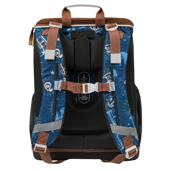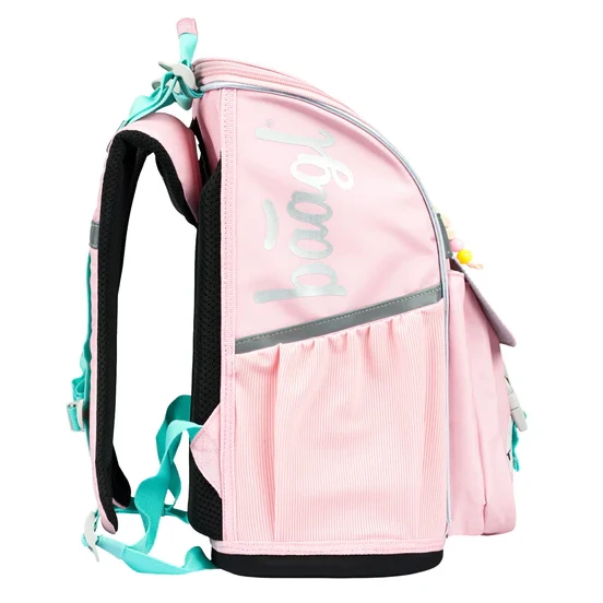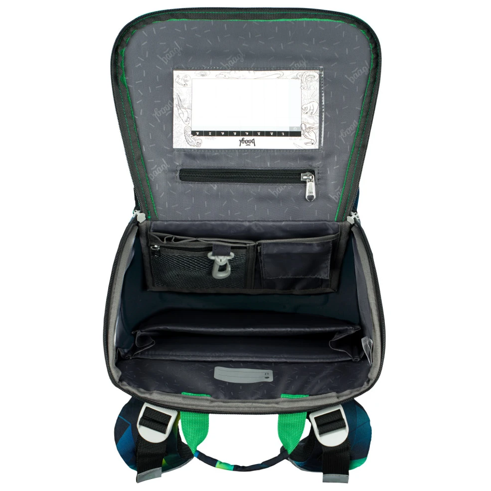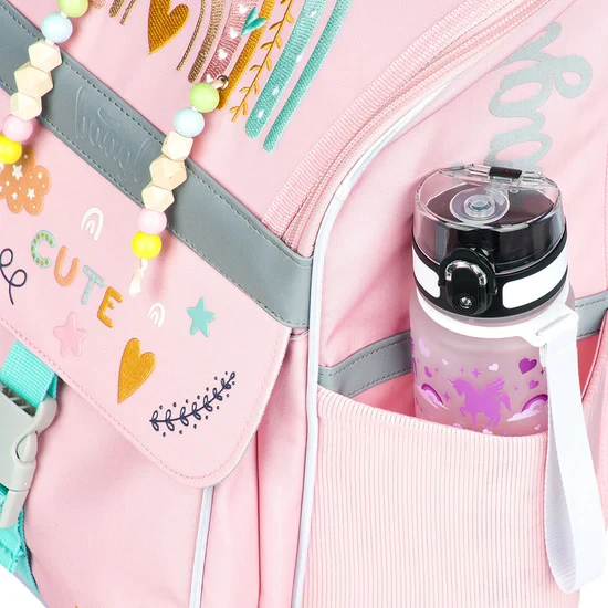 La mochila está hecha de un material resistente al agua y duradero. La construcción reforzada y el fondo rígido mantienen una forma estable en cualquier situación. En el exterior, cuenta con un bolsillo frontal aislado con cierre de hebilla y dos bolsillos laterales con cremallera, ideales para una botella de agua. El compartimento principal es accesible mediante un sistema de apertura abatible, que facilita el acceso a los materiales directamente desde el pupitre. Se abre con cremallera. Dentro del compartimento hay un organizador que ayuda a distribuir mejor el peso de los libros de texto y un bolsillo transparente para el horario escolar. Los elementos reflectantes colocados en todos los lados aumentan la visibilidad del niño en condiciones de poca luz.