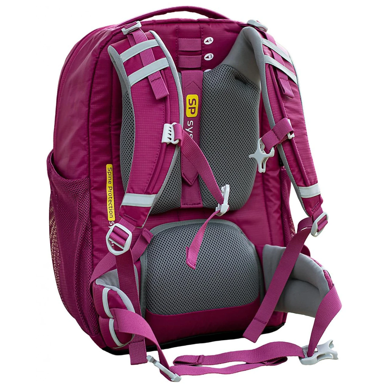 El sistema SP garantiza un uso saludable de la mochila y minimiza los impactos negativos sobre la columna vertebral. Otras ventajas son las cómodas correas para los hombros, la construcción ergonómica con cinturón lumbar que favorece el desarrollo saludable de la columna vertebral del niño. El acolchado lumbar es de malla 3D aireada y cómoda. También hay una correa para el pecho ajustable en altura y longitud.