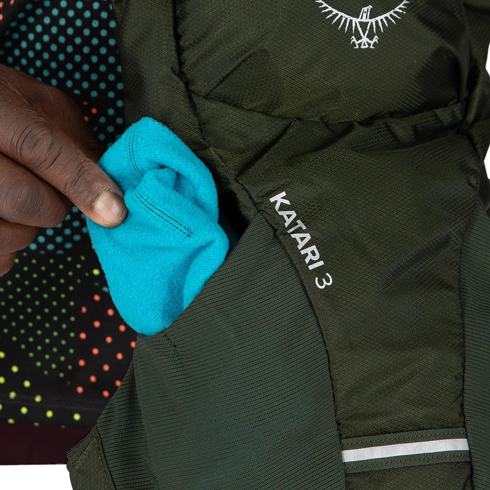 La mochila cuenta con un bucle para luces intermitentes, una correa magnética para el pecho para una botella de agua, un bolsillo externo acolchado para el teléfono o las gafas, un compartimento vertical con cremallera en el panel frontal con un organizador de herramientas y dos mallas elásticas. bolsillos laterales y un bolsillo externo para bolsa hidráulica Osprey Hydraulics™ 2,5 L (se vende por separado)