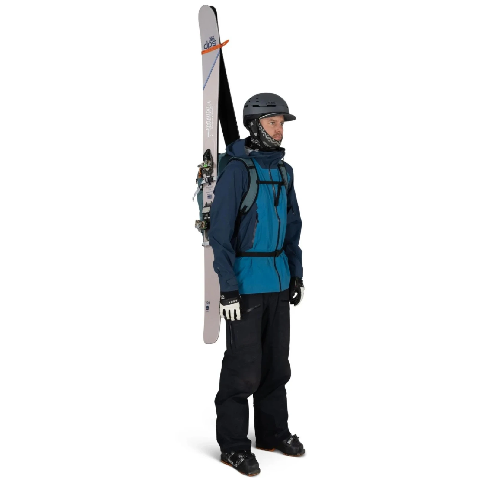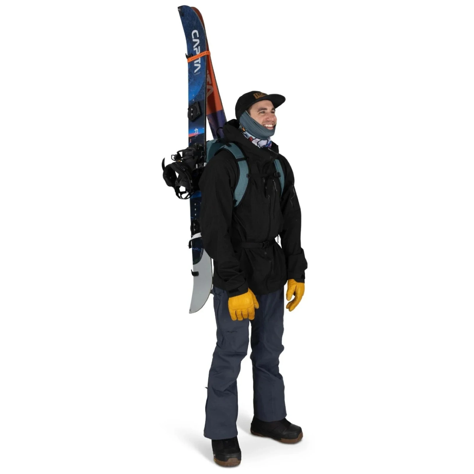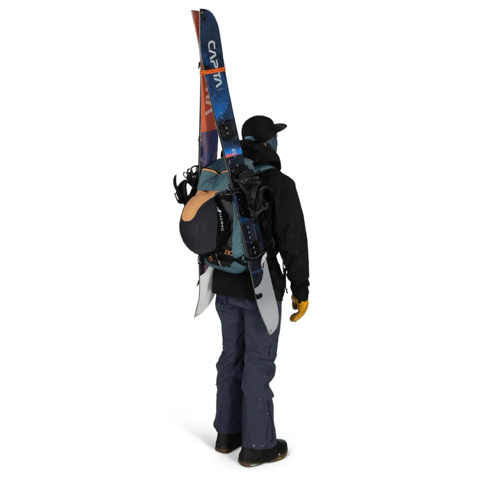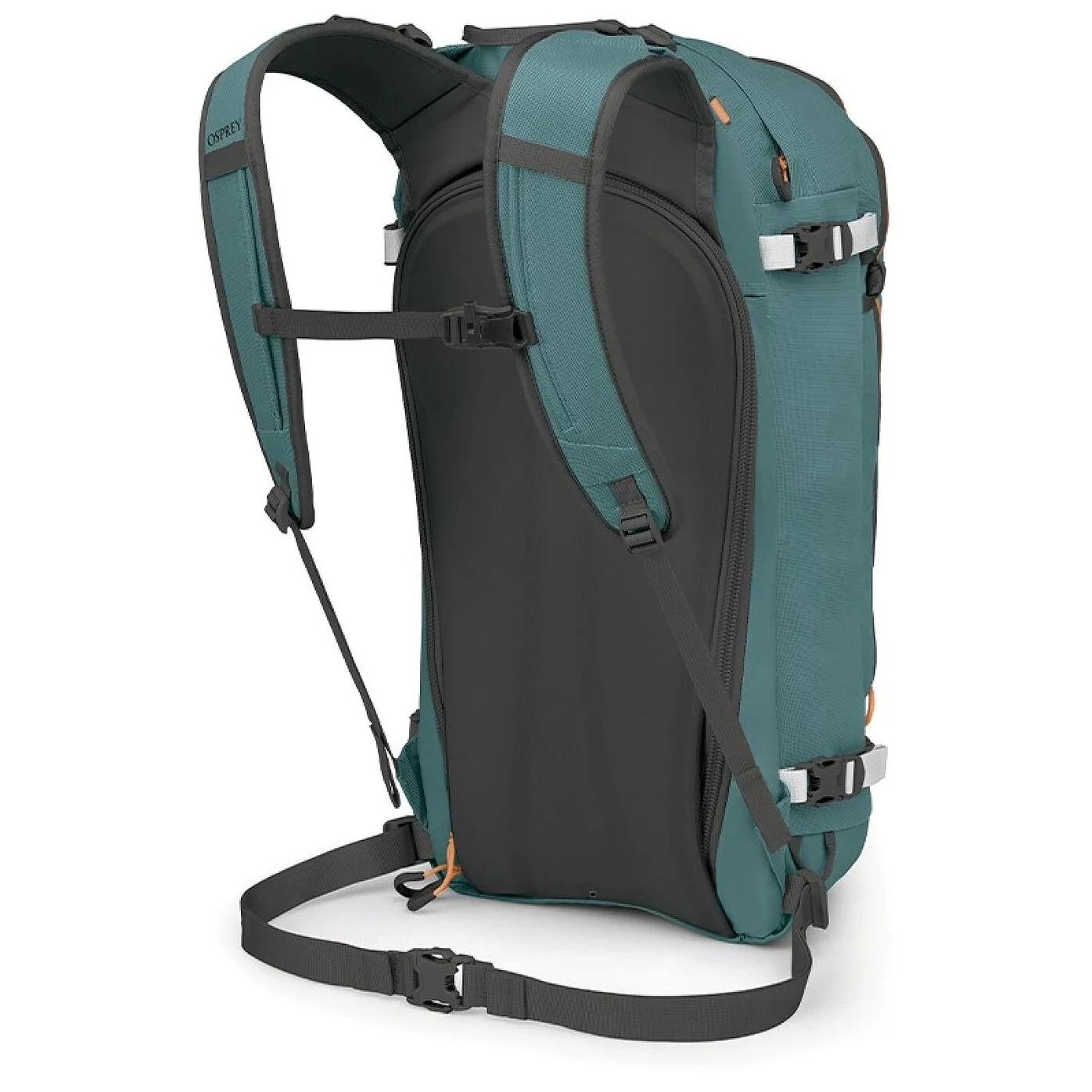 También incluye soportes para piolets, casco o raquetas de nieve y varios bolsillos interiores para objetos pequeños, un termo o dispositivos electrónicos. La mochila permite fijar los esquíes en configuración A-frame o en diagonal y la tabla de snowboard vertical u horizontalmente.