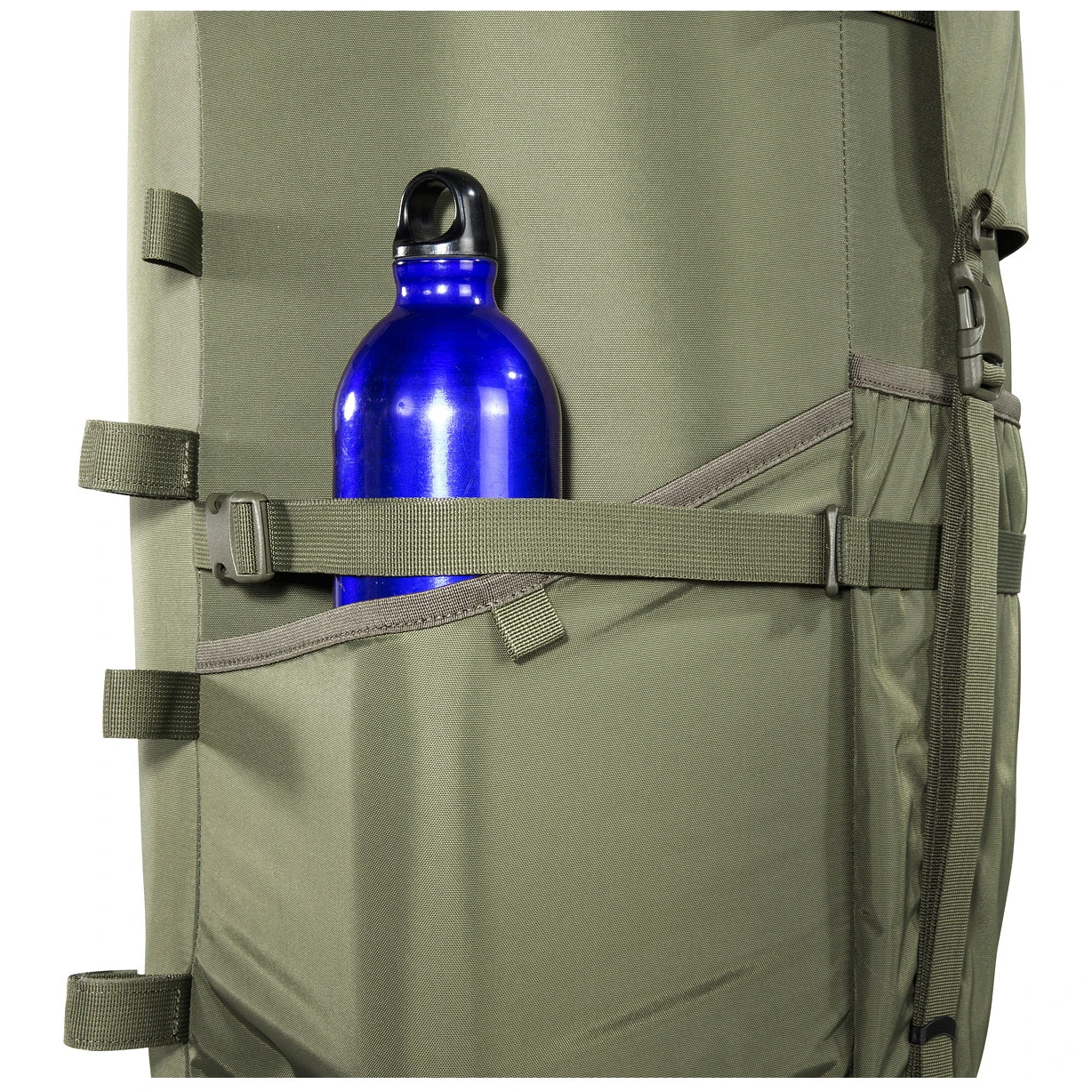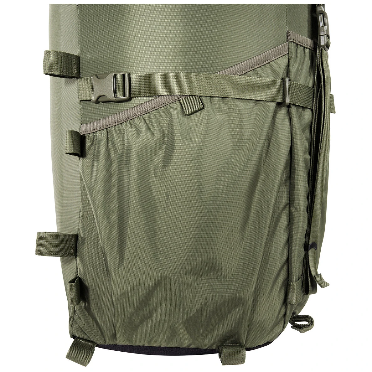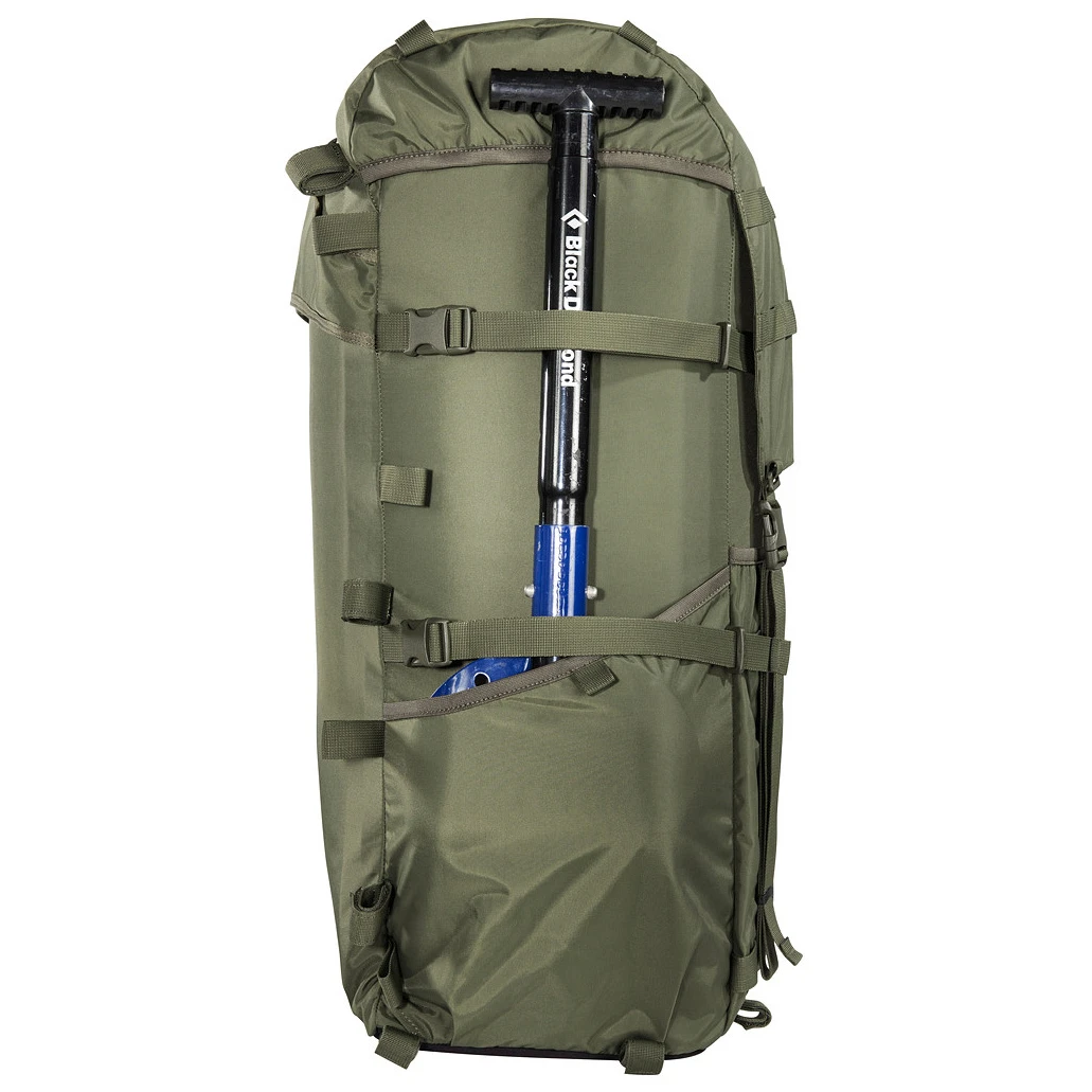 Ofrece grandes bolsillos en los laterales y en la parte delantera, trabillas para material en la tapa y en la parte delantera y una práctica protección contra la nieve con cordón debajo de la tapa. Gracias a las correas de compresión, es posible apretar firmemente la carga y garantizar la estabilidad al transportarla.