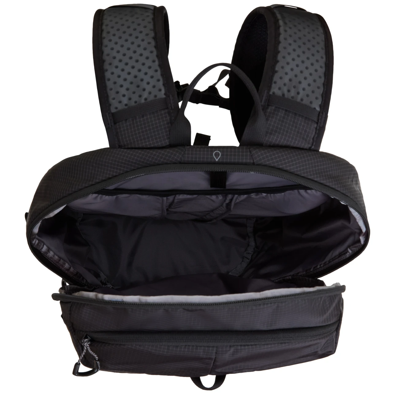 Para un transporte cómodo incluso con carga pesada, la mochila está equipada con un cinturón lumbar ajustable y una correa pectoral con silbato. Los tirantes acolchados y ventilados también garantizan la comodidad. Un elemento práctico es el sistema frontal de cordones elásticos, que permite sujetar rápidamente una chaqueta u otro equipo.