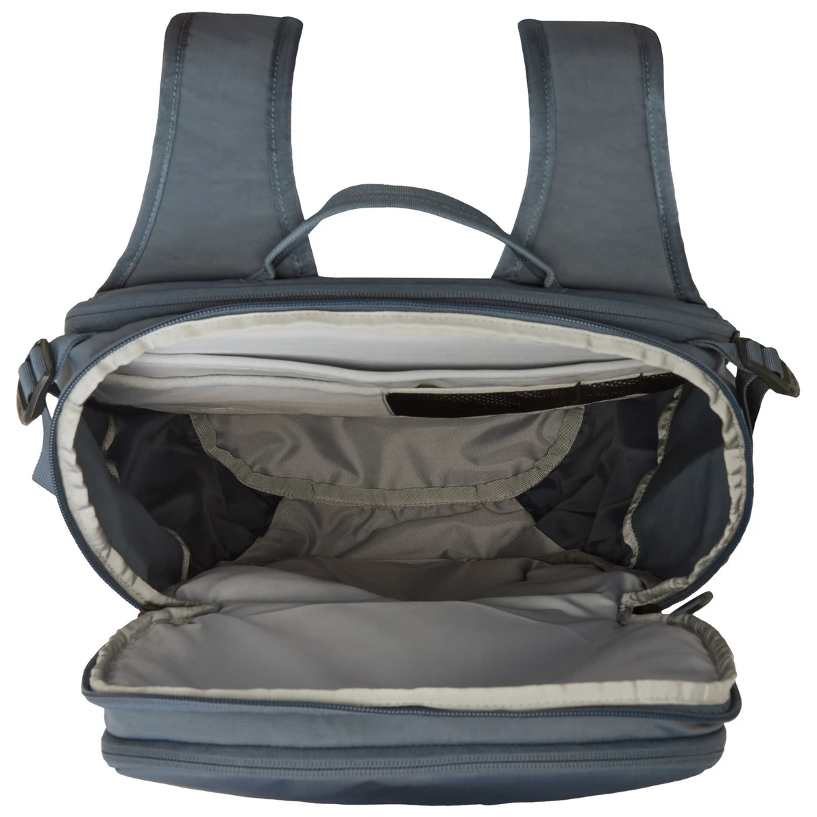 La mochila ofrece un espacioso compartimento principal con cremallera con mucho espacio para los artículos de trabajo y de viaje. Un bolsillo interior de malla con cremallera de seguridad y gancho para llaves facilita la organización de tus objetos pequeños, mientras que un compartimento para el portátil forrado de forro polar protege tu portátil de 13" o 15".