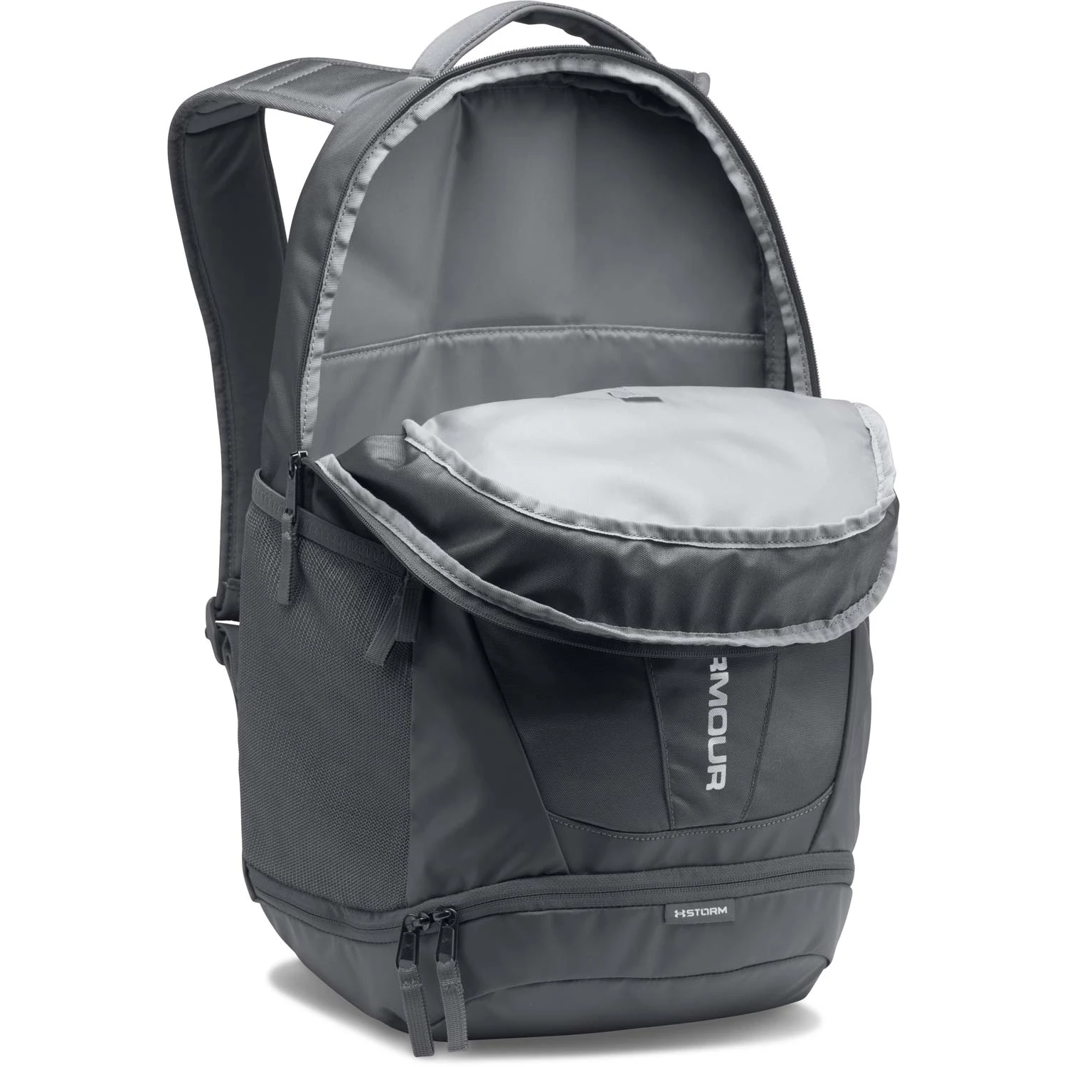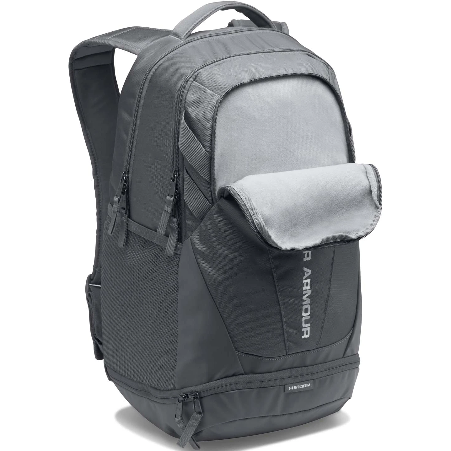 Durable de dos cámaras mochila para portátil Under Armour El material original Hustle 3.0 con tecnología Storm1 que garantiza la resistencia al agua protegerá tus pertenencias . El fondo es de material extra resistente a los pinchazos. En el bolsillo acolchado puede introducirse un ordenador portátil de 15". Los tirantes ajustables de material transpirable HeatGear garantizan la máxima comodidad. La mochila tiene una entrada inferior con un bolsillo, por ejemplo para zapatos. Dos bolsillos laterales para botellas y bolsillos adicionales para organizar todo lo esencial. Logotipo e inscripción Under Armour en color contraste.