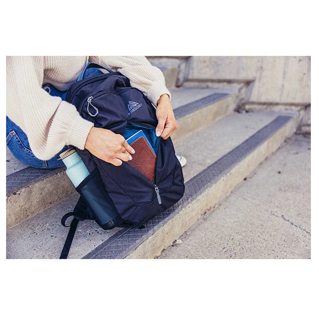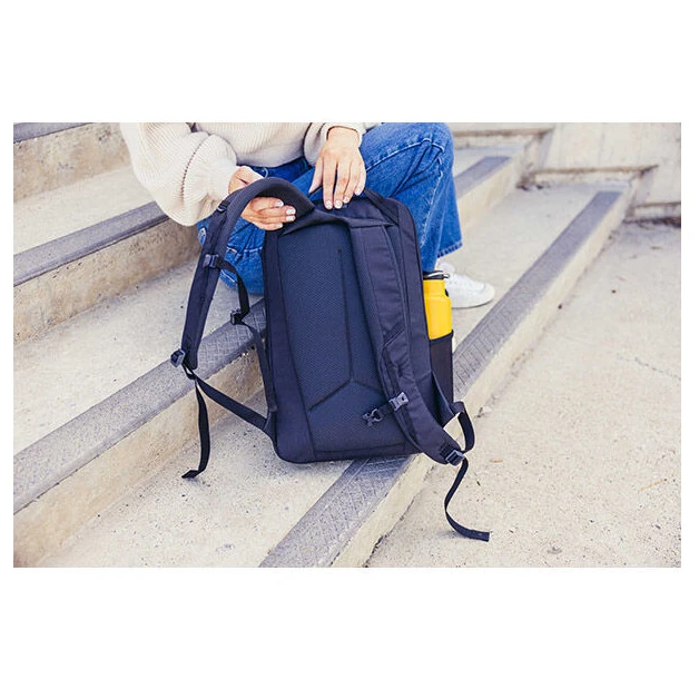 La mochila Retna 25 de la marca Gregory tiene un panel trasero de espuma de múltiples densidades y malla Airmesh para una comodidad de uso. Todos los tejidos están hechos de material reciclado, lo que conlleva una reducción del 59 % en la huella de carbono en comparación con un embalaje de nailon convencional. Por supuesto, cuenta con una correa de hombro acolchada y moldeada con una correa de pecho extraíble y un compartimento acolchado para el portátil con acceso externo. Durante el uso diario normal, también apreciarás el bolsillo superior con cremallera de acceso rápido y el bolsillo lateral para la botella de malla elástica.