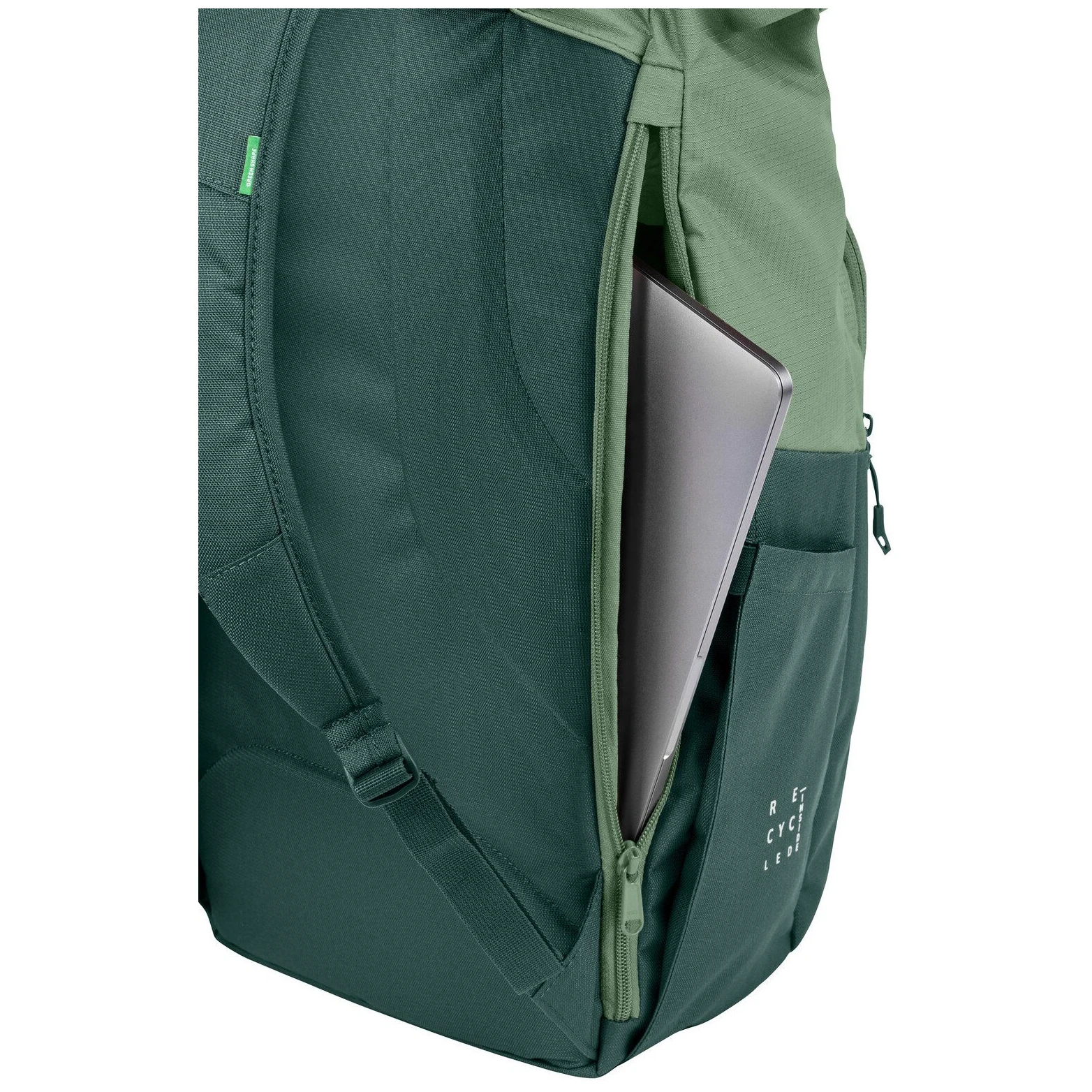 La mochila tiene un compartimento acolchado para portátil de hasta 13,3 pulgadas, accesible desde arriba y por el lateral, un compartimento principal con organizador y un bolsillo frontal con cremallera y organizador. El compartimento principal tiene un cierre de tapa enrollable. En los laterales hay bolsillos para botellas de bebida. Por supuesto, hay correas para sujetar el casco de la bicicleta y un asa que facilita levantar la mochila.