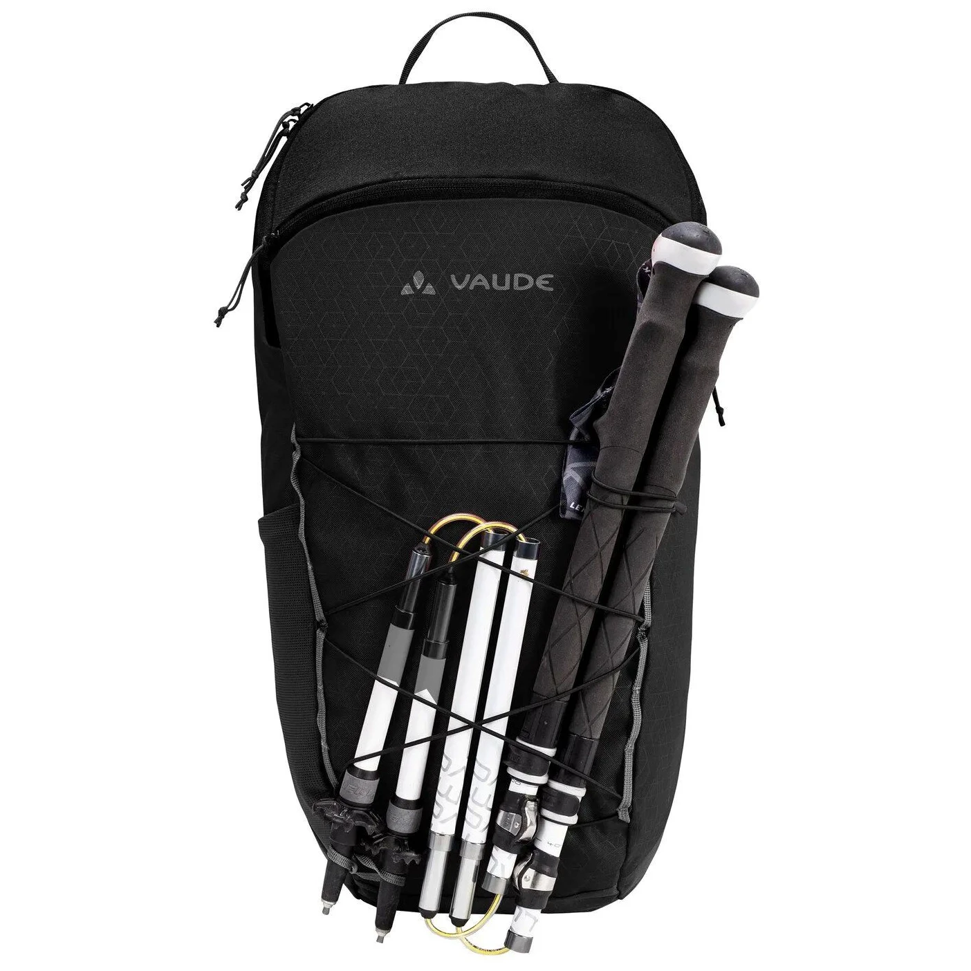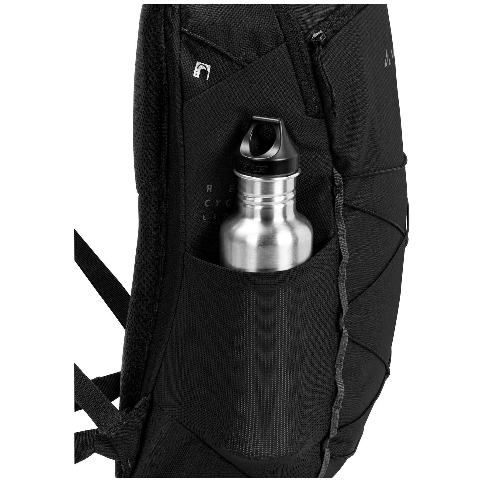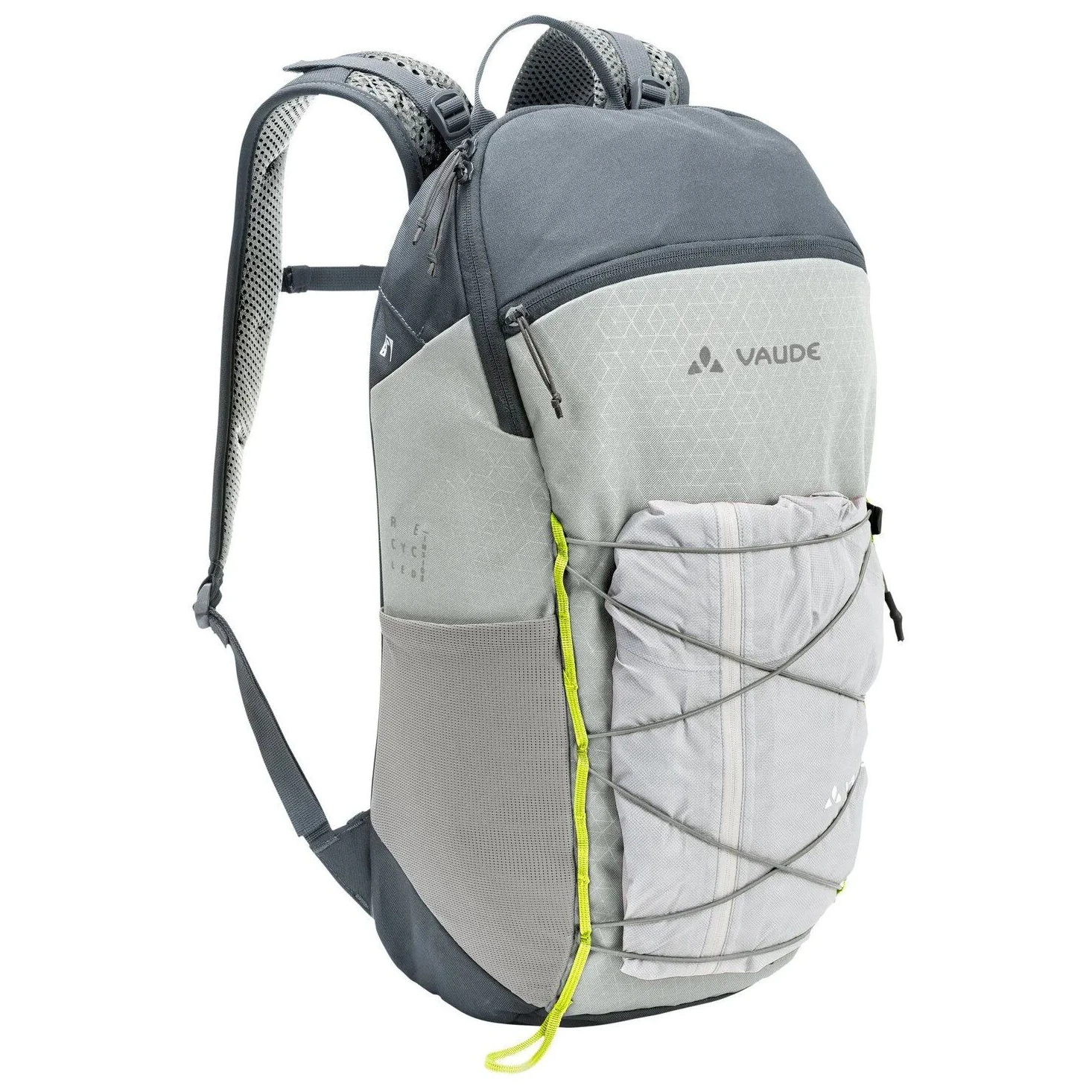 El bolsillo principal tiene espacio para un impermeable, un refrigerio, agua y objetos pequeños, el bolsillo lateral con cremallera permite un acceso rápido al teléfono o las llaves, y el cordón elástico en la parte delantera sirve para sujetar un casco o una chaqueta. La mochila está fabricada con poliéster 100% reciclado y cuenta con un acabado Eco Finish sin PFC que repele el agua y la suciedad. Las certificaciones VAUDE Green Shape y bluesign® confirman una producción ecológica y sostenible.
