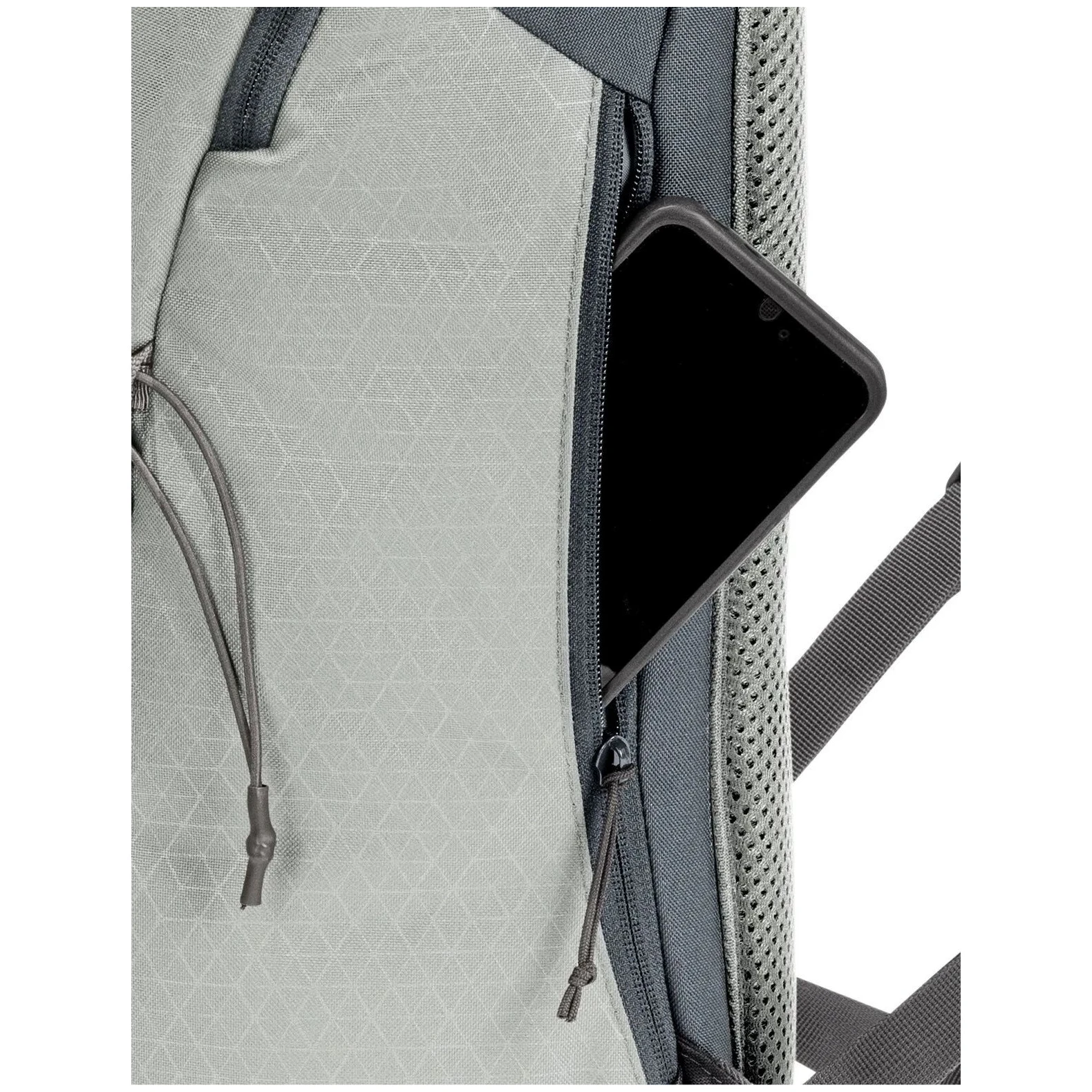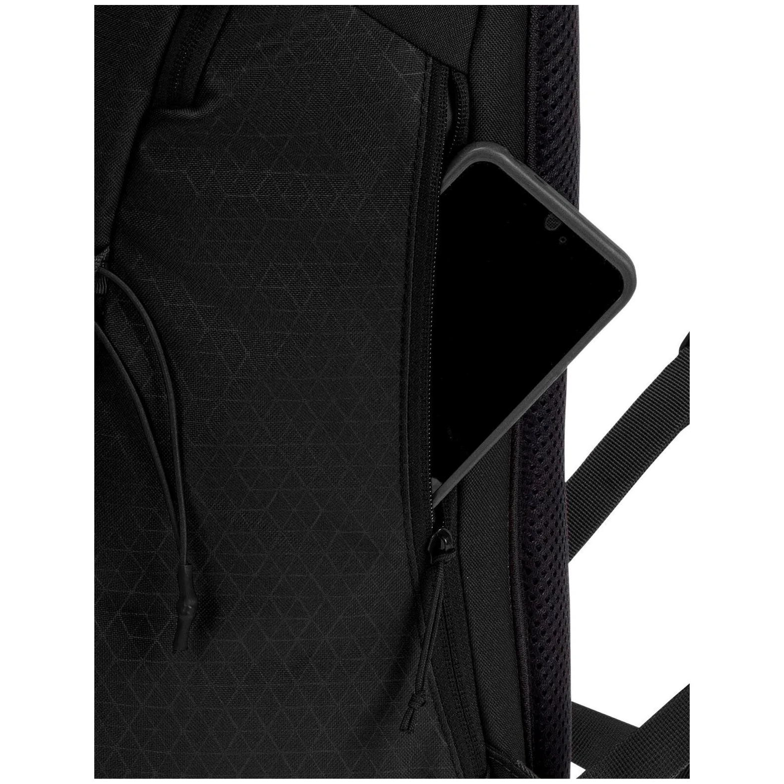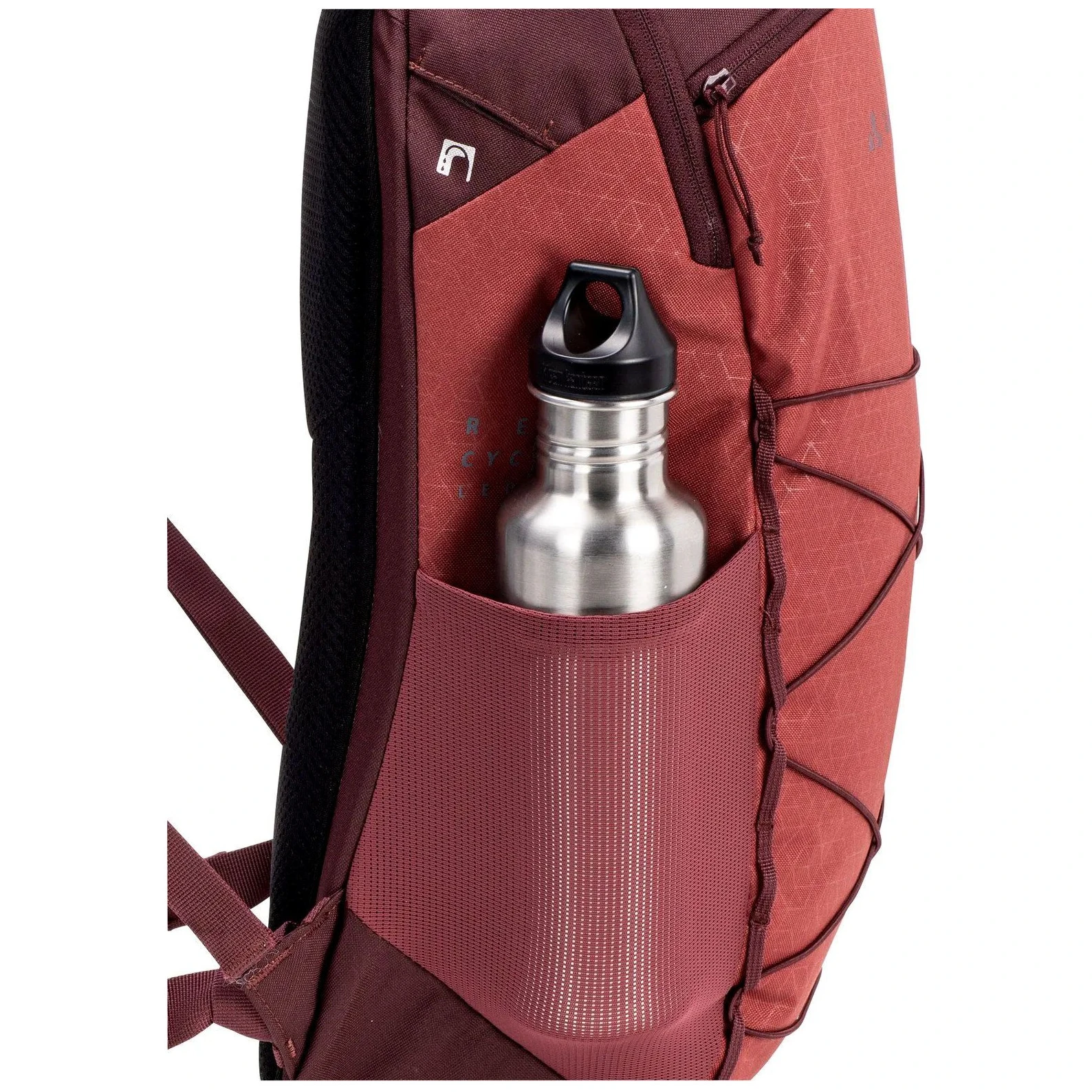 El bolsillo principal tiene espacio para un impermeable, un refrigerio, agua y objetos pequeños, el bolsillo lateral con cremallera permite un acceso rápido al teléfono o las llaves, y el cordón elástico en la parte delantera sirve para sujetar un casco o una chaqueta. La mochila está fabricada con poliéster 100% reciclado y cuenta con un acabado Eco Finish sin PFC que repele el agua y la suciedad. Las certificaciones VAUDE Green Shape y bluesign® confirman una producción ecológica y sostenible.
