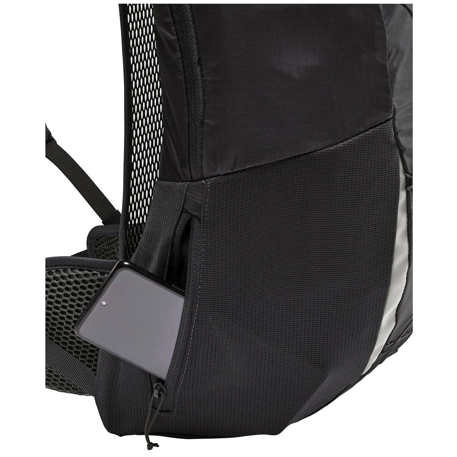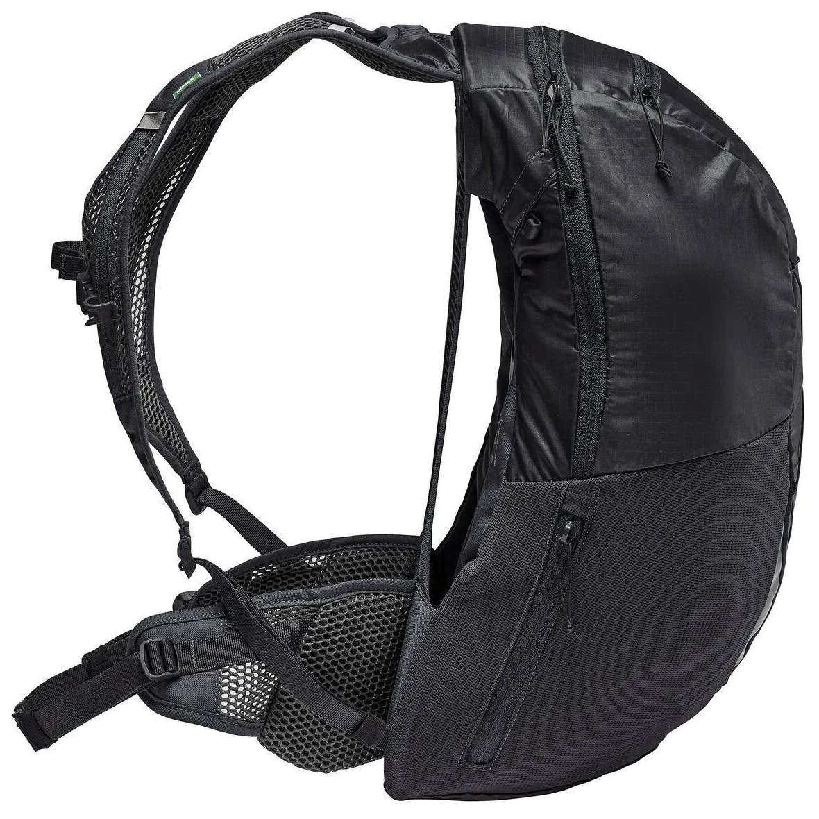 La mochila está fabricada con materiales ecológicos: el tejido principal siliconado se creó mediante un proceso de balance de masas a partir de neumáticos reciclados, complementado con poliéster PET reciclado. El tratamiento Eco Finish sin PFC repele el agua y la suciedad. Las certificaciones VAUDE Green Shape y bluesign® garantizan la sostenibilidad y una producción justa.