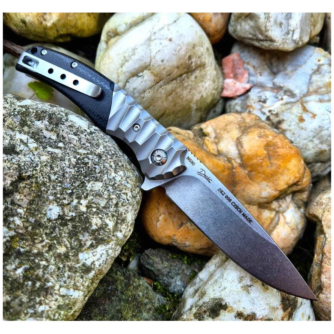 El mango de Titanio resistente y Micarta elegante garantiza un agarre firme y seguro en cualquier condición. La hoja de acero inoxidable N690 con acabado Stonewash mate ofrece excelentes propiedades de corte y resistencia a la corrosión. Gracias a los rodamientos axiales, la apertura y el cierre del cuchillo son extraordinariamente suaves, mientras que el robusto seguro LinerLock garantiza la máxima seguridad durante el trabajo. Las prácticas ranuras en el lomo de la hoja aumentan el control durante el corte y permiten un mejor guiado del cuchillo.