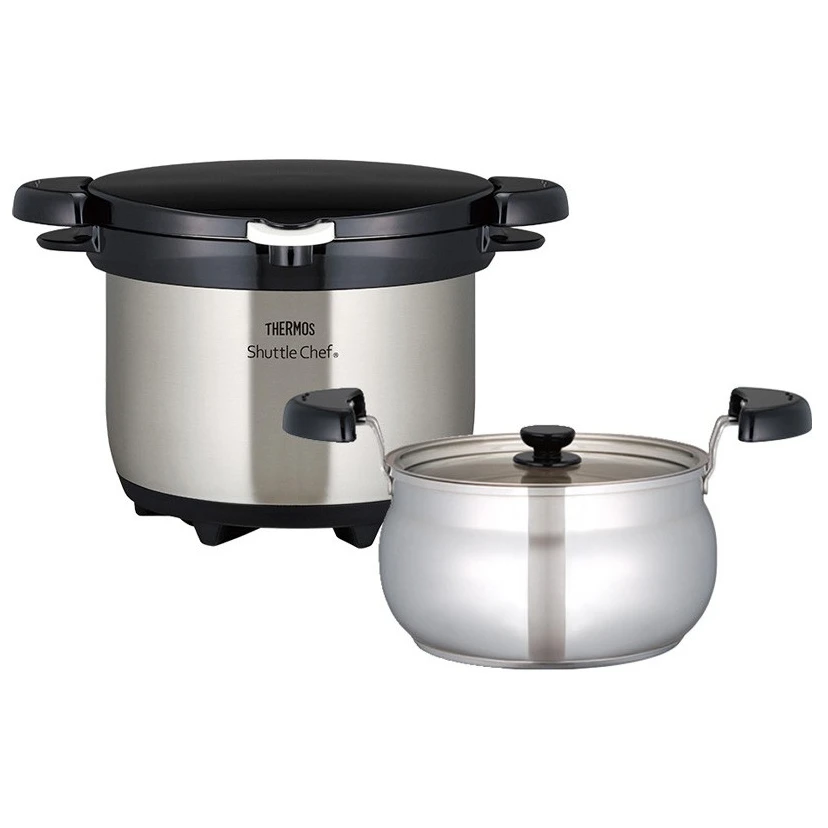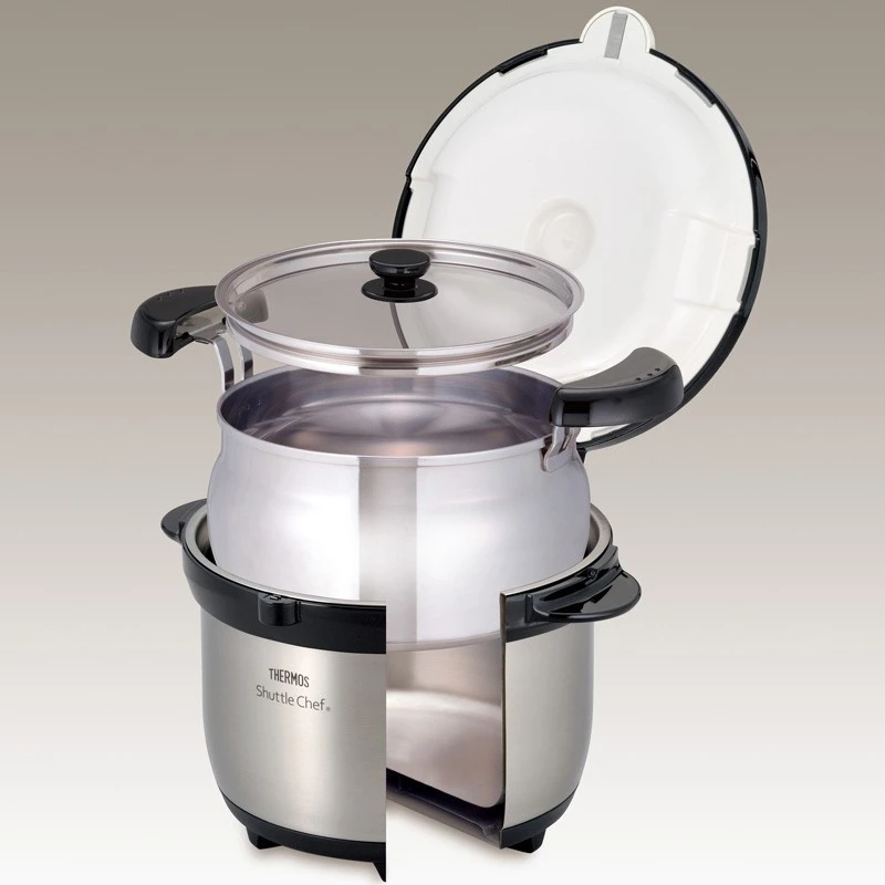Thermos Shuttle Chef es una olla de cocción lenta con aislamiento de vacío diseñada para una cocina eficiente, saludable y cómoda sin necesidad de supervisión constante. Presentado en Japón en 1989, ha ganado una gran popularidad entre los entusiastas del aire libre para la preparación fácil de comidas en cabañas, campamentos o reuniones familiares en el jardín. También es ideal para cocinar en casa de forma habitual. Su principio se basa en calentar brevemente la comida en una cocina normal y luego terminar de cocinar manteniendo la temperatura propia en un recipiente aislado, sin aporte adicional de energía.