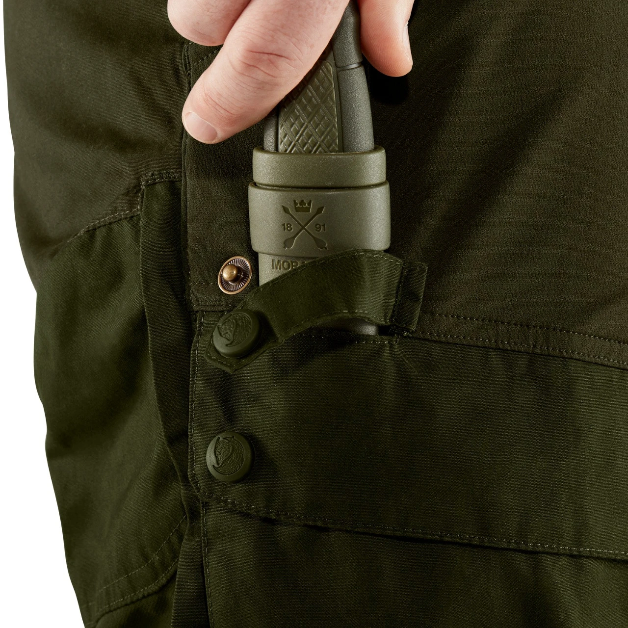 Para regular la temperatura, cuenta con aberturas de ventilación con cremallera desde las caderas hasta las rodillas y a lo largo de las pantorrillas, lo cual es práctico durante actividades de alta intensidad en el terreno. Los pantalones disponen de varias opciones de almacenamiento: dos grandes bolsillos en las perneras (el izquierdo con un bolsillo interior de malla para el teléfono o la radio y una cremallera para guardarlo de forma segura), un bolsillo para el cuchillo y dos bolsillos para las manos.