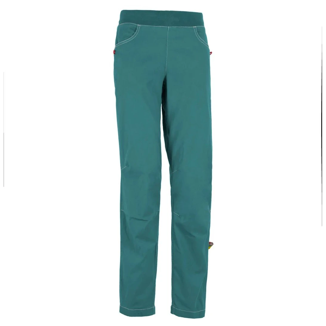 Los pantalones de escalada para mujer E9 Mia-S2.4 Women's están fabricados con un 64% de lyocell, un 34% de algodón orgánico y un 2% de elastano. Los pantalones tienen una cintura elástica sin cierre y un dobladillo inferior elástico en las piernas. Tienen dos grandes bolsillos delanteros y un bolsillo trasero con un pequeño logo de E9 bordado. Tienen bucles para un cepillo de dientes en ambos lados. Están fabricados en Italia con una mínima contaminación ambiental y con énfasis en un diseño extravagante, un diseño único y comodidad para la escalada.