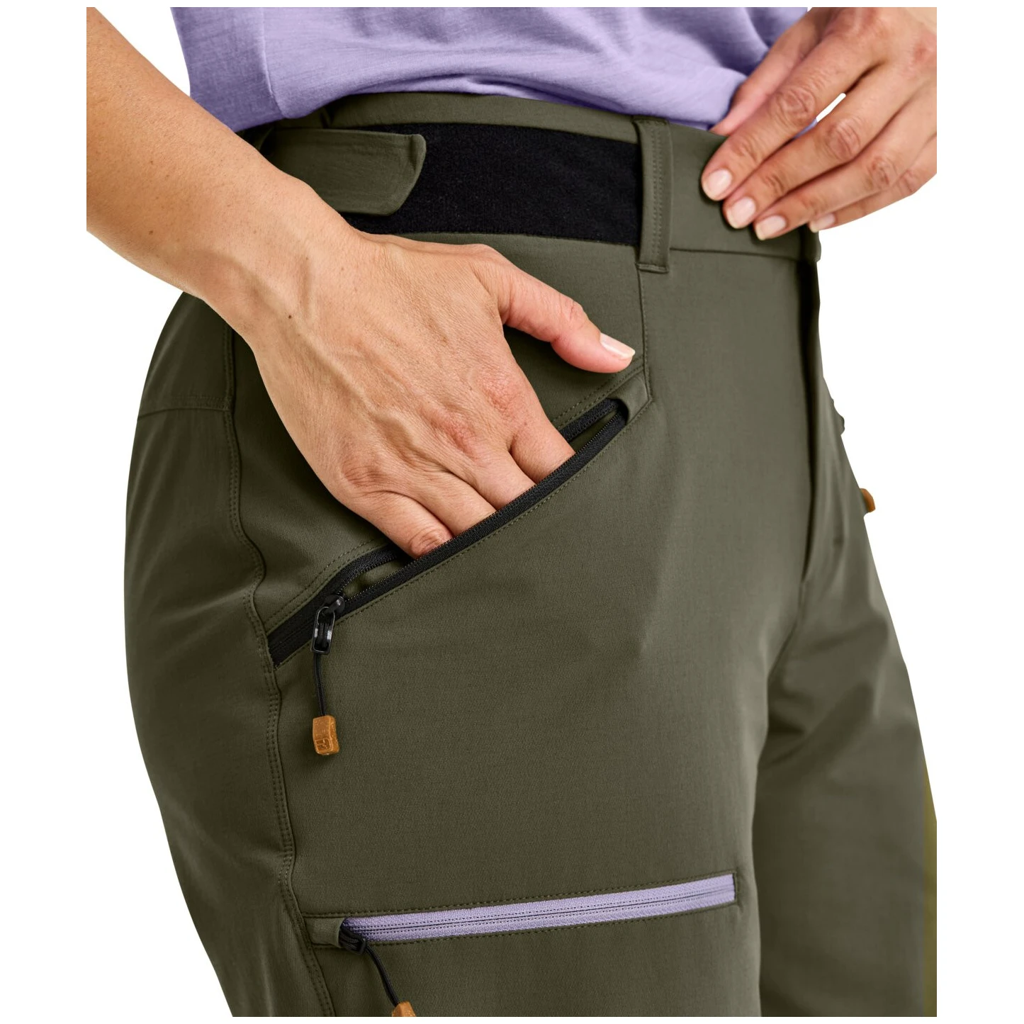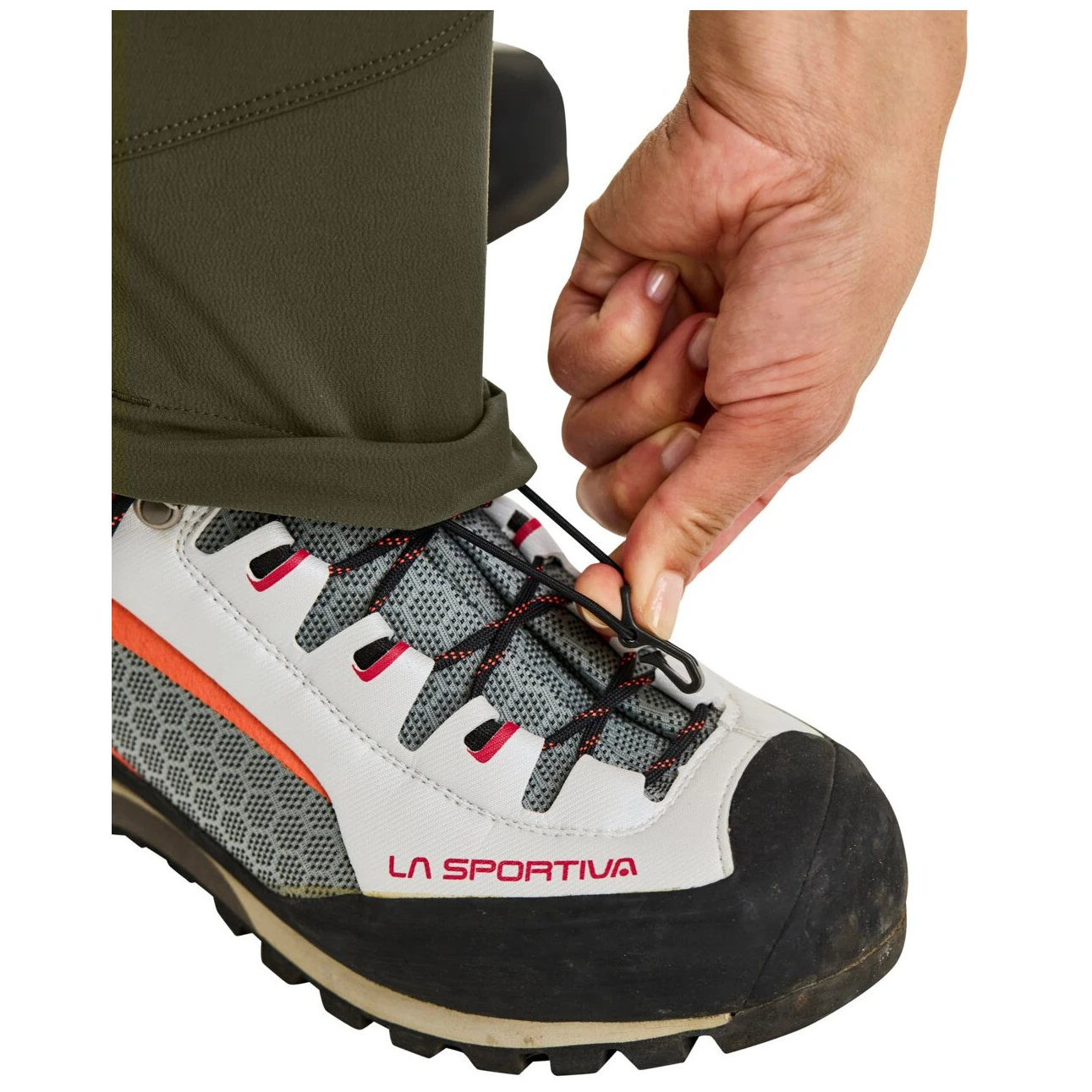 Los detalles prácticos realzan la funcionalidad de los pantalones: corte regular de buen ajuste, cintura y dobladillo inferior ajustables para una adaptación precisa, dos bolsillos en los laterales y uno en el muslo para facilitar el acceso a las cosas, puños robustos en los tobillos con un gancho para los cordones que evita que entren piedras o nieve, y un corte ergonómico para máxima libertad de movimiento en terrenos alpinos.