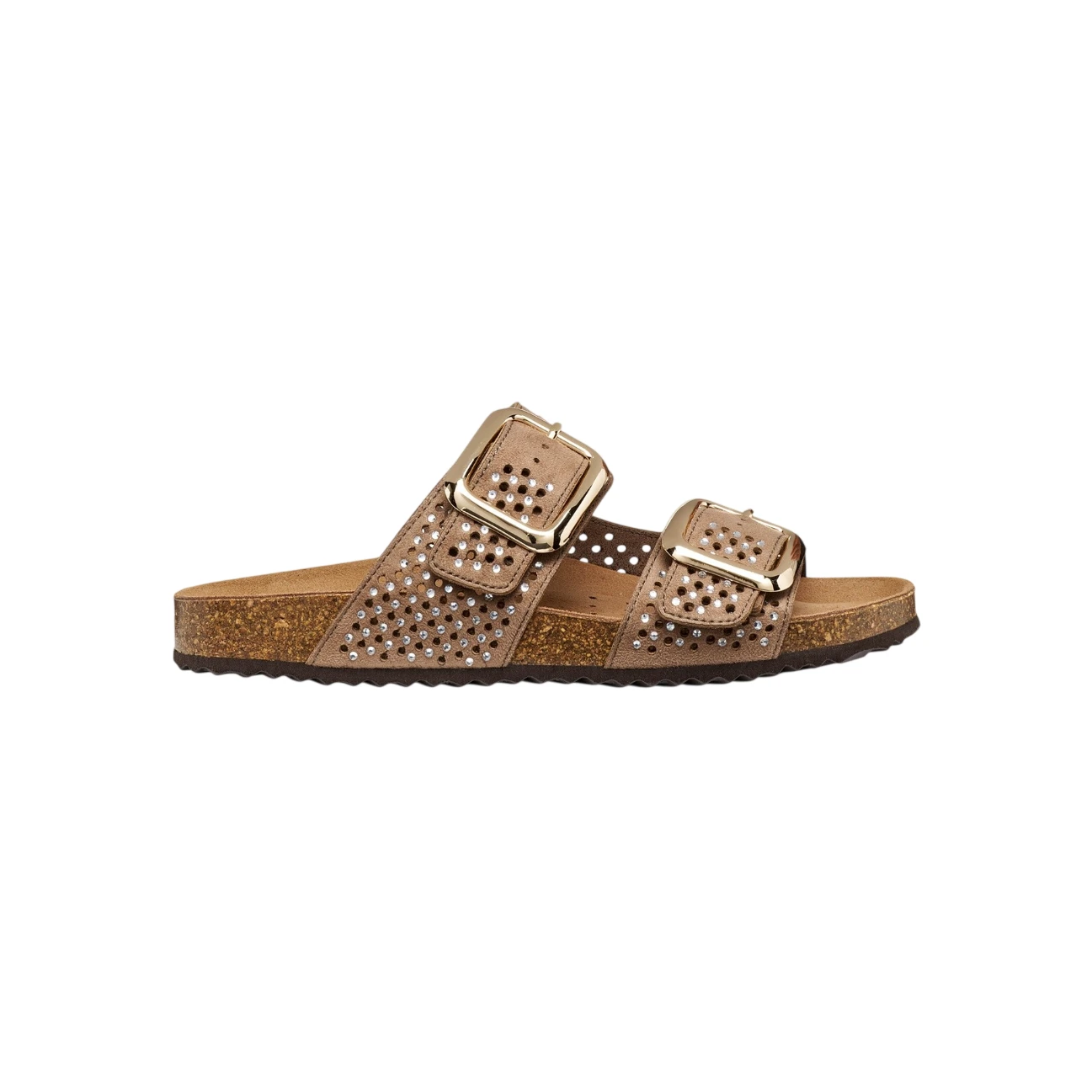 Zapatillas de mujer Geox Brionia R con un aspecto lujoso realzado por la parte superior metálica. Dos tiras anchas adornadas con tachuelas y hebillas decorativas en el mismo tono aportan un carácter distintivo y elegante al calzado. Este modelo es ideal para mujeres que desean combinar comodidad con un elegante estilo veraniego.