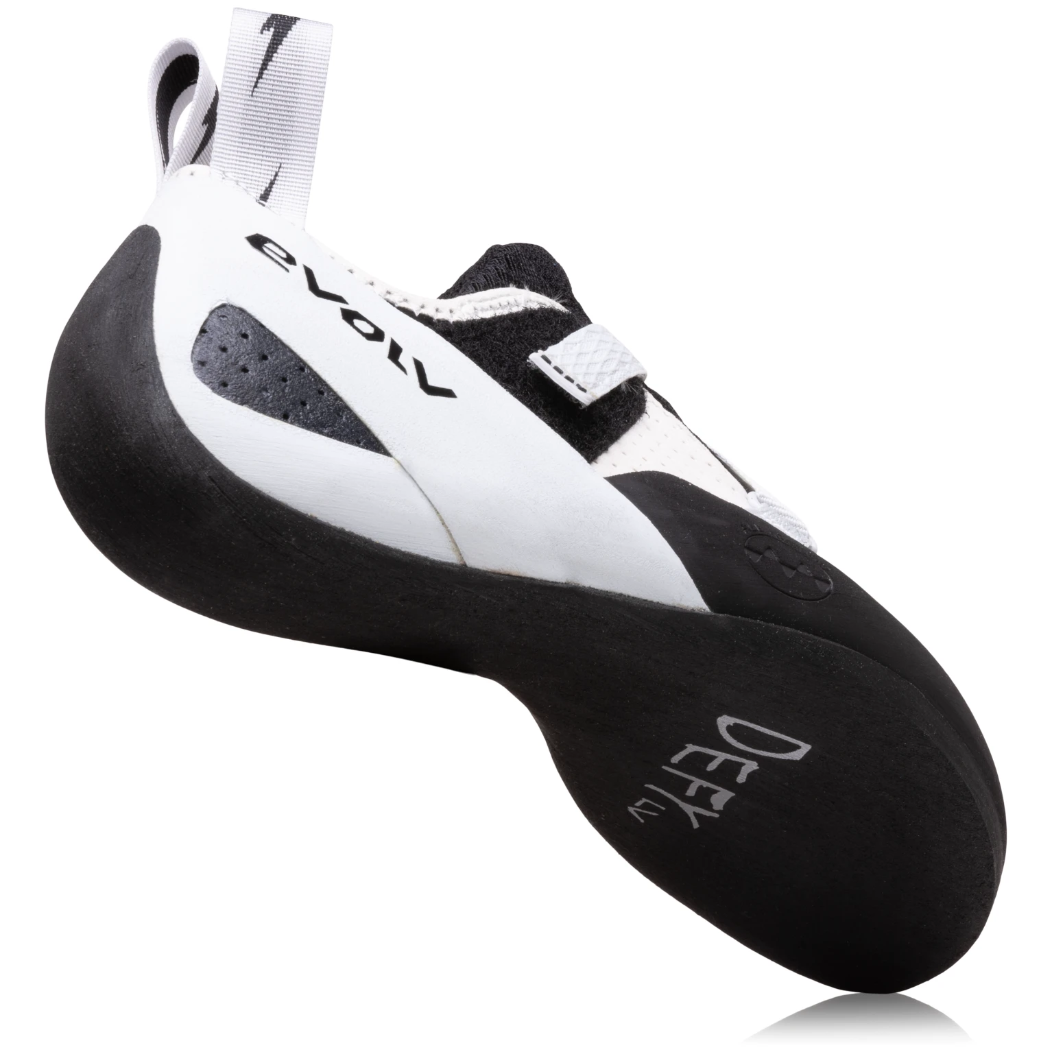 Las zapatillas de escalada de alto nivel Evolv Defy LV están diseñadas con una ligera asimetría y curvatura, lo que permite una colocación más precisa del pie y ayuda a los nuevos escaladores a mejorar más rápidamente en comparación con la mayoría de las zapatillas de escalada planas y simétricas para principiantes.