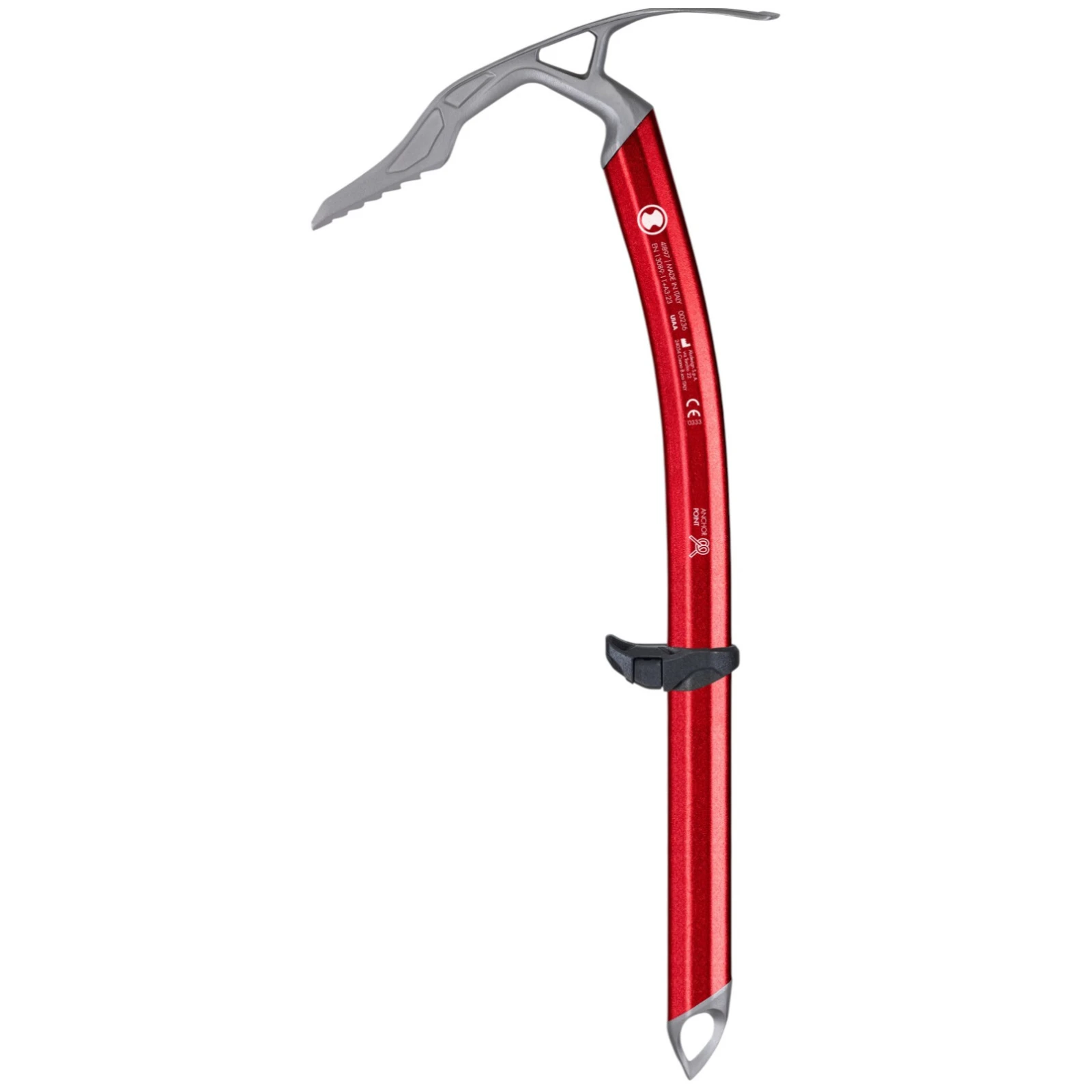 El piolet está disponible en dos longitudes y, gracias a la combinación de materiales y su diseño moderno, ofrece alta resistencia al desgaste y bajo peso. Detalles prácticos, como el orificio para el mosquetón o el marcado para un aseguramiento correcto, aumentan su versatilidad en el terreno.