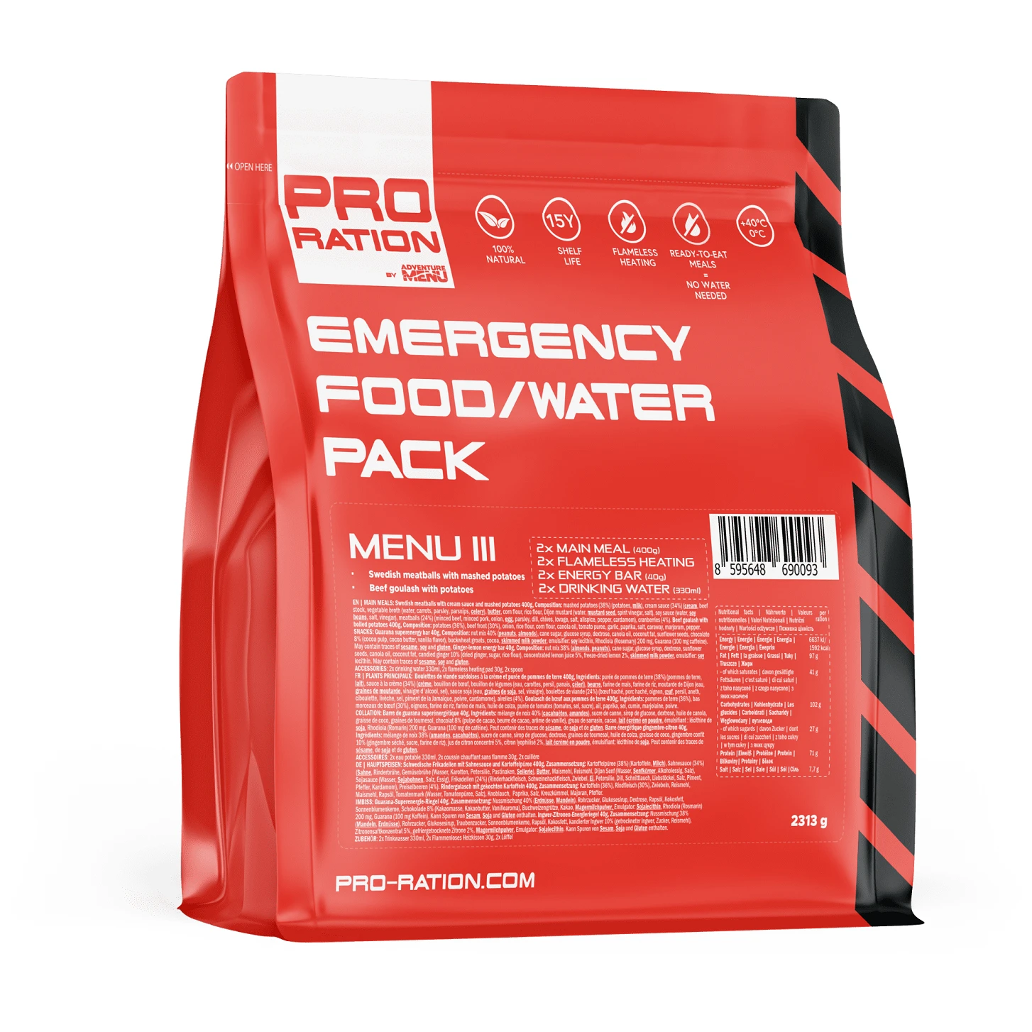 PRO-RATION Emergency Pack MENU I es el resultado de más de dos años de colaboración con los equipos de rescate checos. Este paquete compacto le asegura alimentos y agua potable de calidad para momentos críticos, con una durabilidad de hasta 15 años para los alimentos y 50 años para el agua.