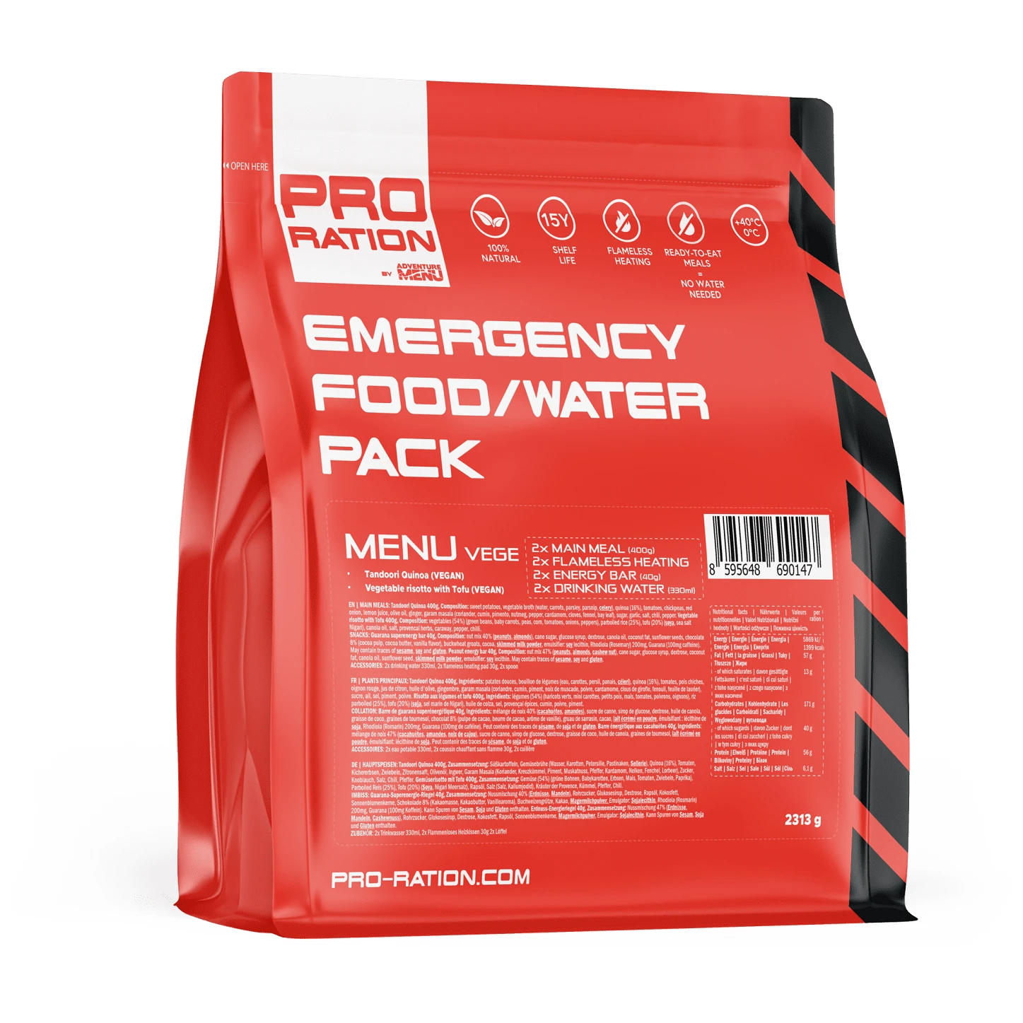 El pack de comida/agua de emergencia, Menu, son provisiones de emergencia con una vida útil de 15 años. 2 comidas, barritas energéticas, agua, autocalentamiento. Para el hogar y el coche.